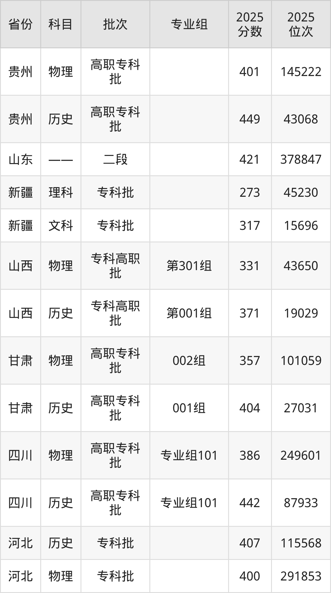 普通类专科历史类最低449分,专科物理类最低401分