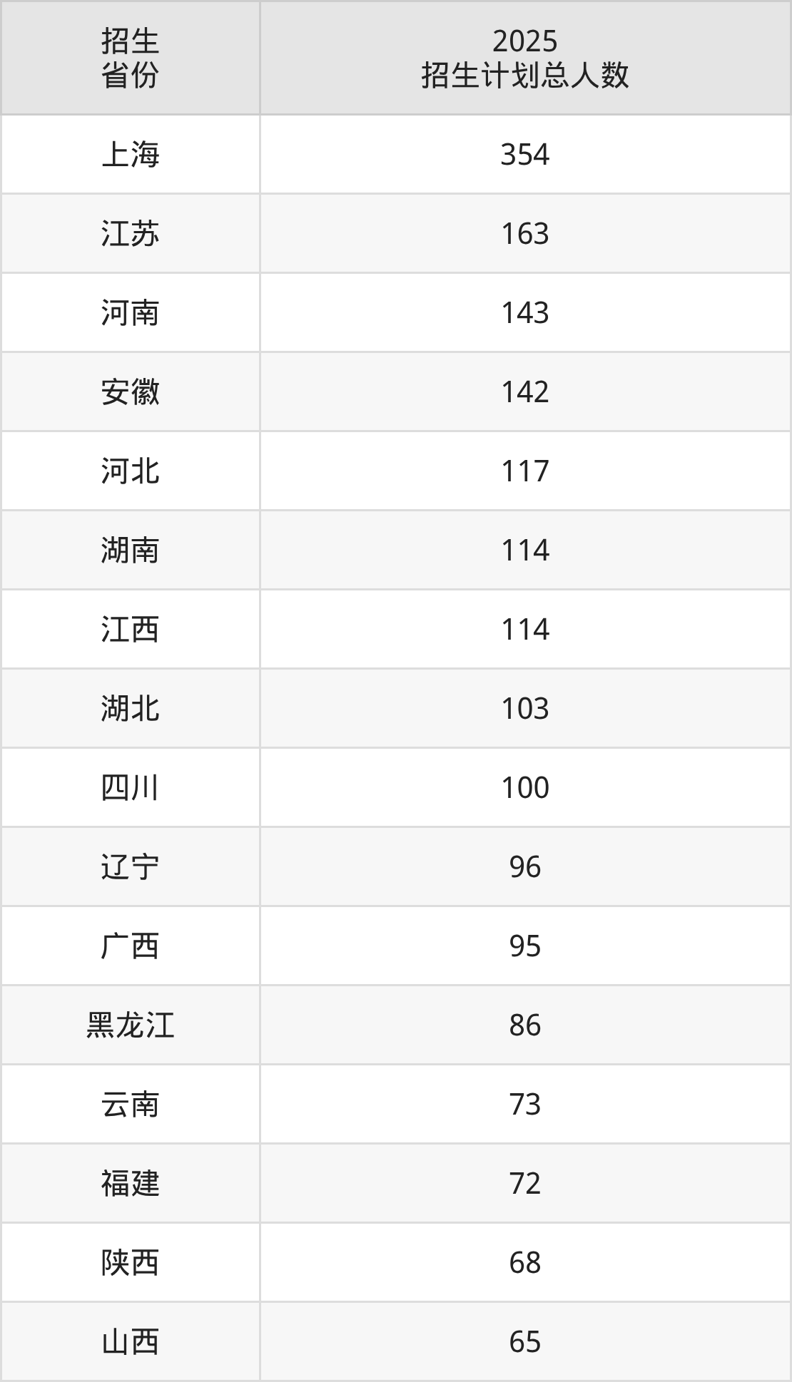 2025年东华大学面向全国28个省市开展本科招生;招生专业共31个,招生人数共2446人。2025年在上海市招生计划总人数是354人,其中,东华大学在上海市招生人数最多的是电子信息类。东华大学在各省具体招生人数情况如下表。