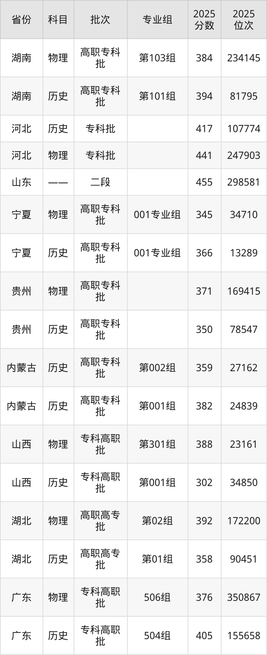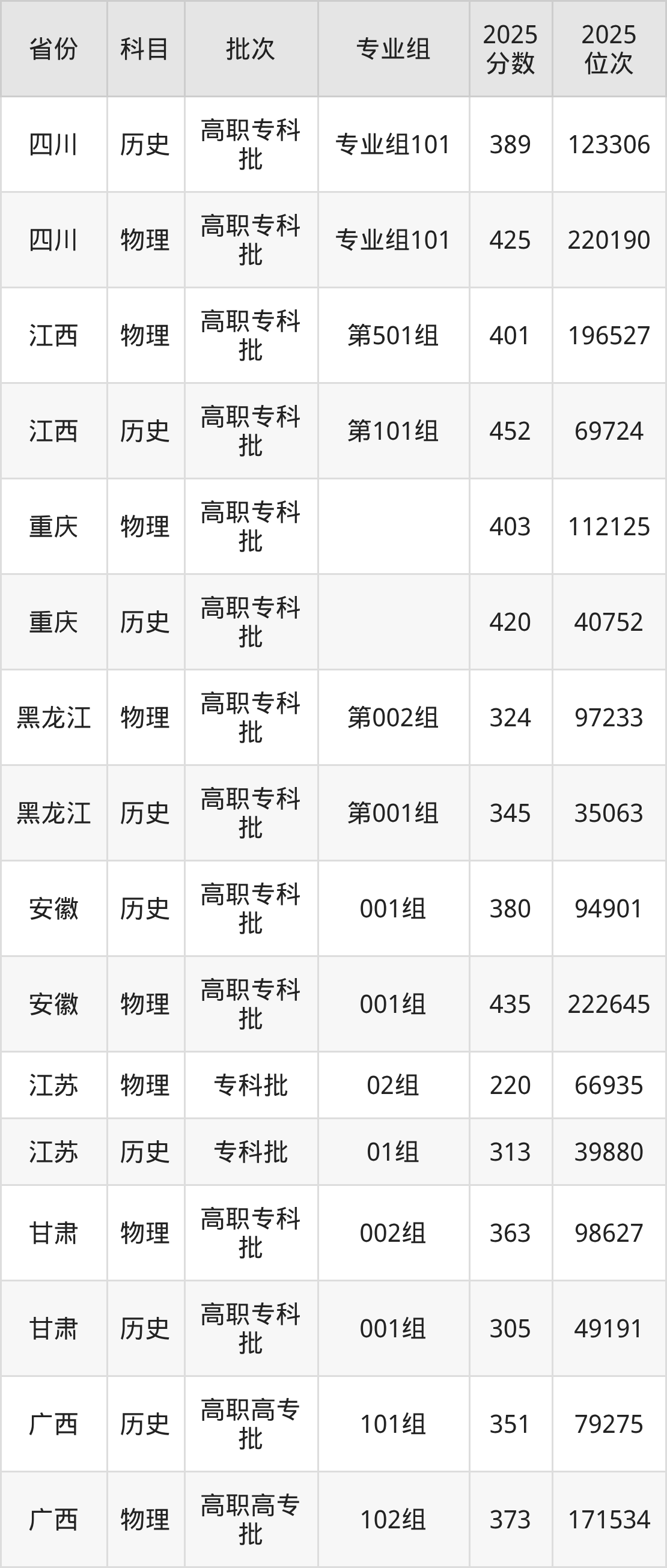2025年在专科历史类进行招生,各专业组分数线详情如下: