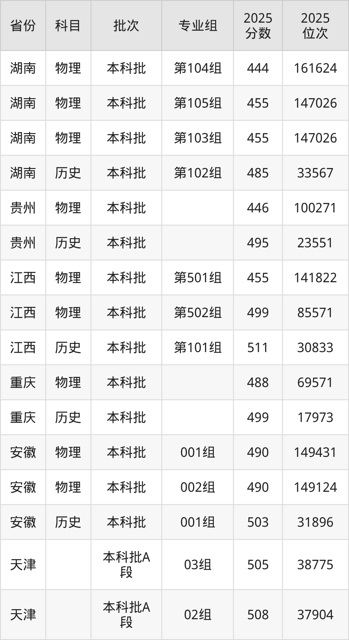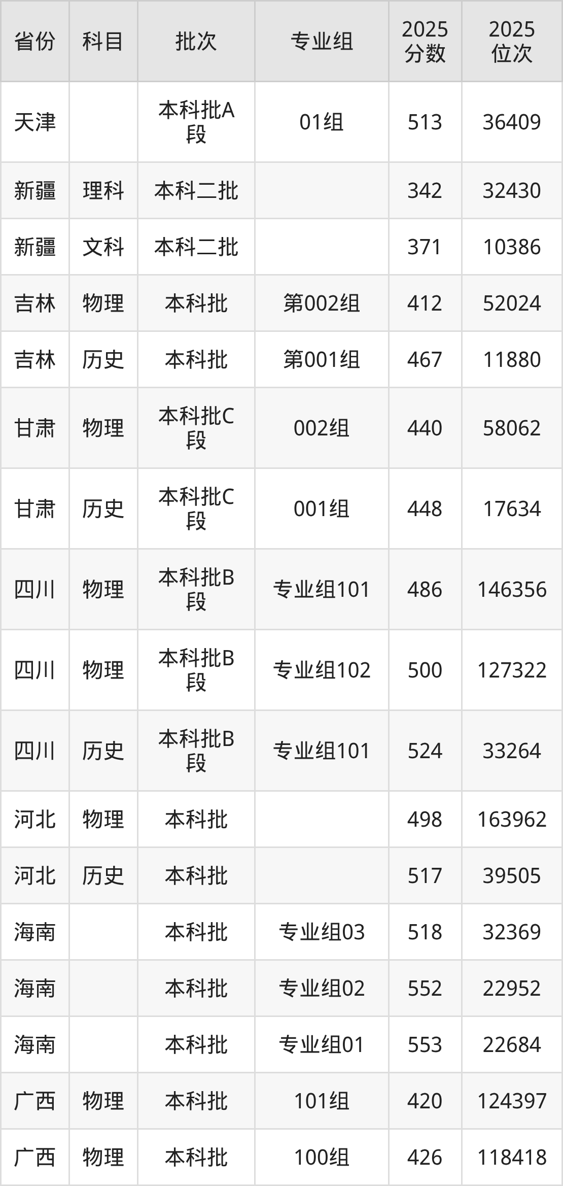 2025年投档录取最低分为342分,录取最低位次为32430名。