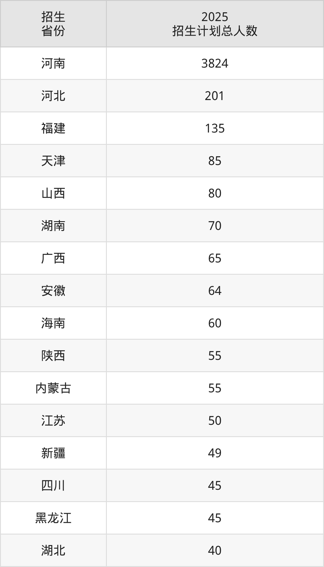 2025年河南城建学院面向全国28个省市开展本科招生;招生专业共46个,招生人数共5163人。2025年在河南省招生计划总人数是3824人,其中,河南城建学院在河南省招生人数最多的是电气工程及其自动化。河南城建学院在各省具体招生人数情况如下表。