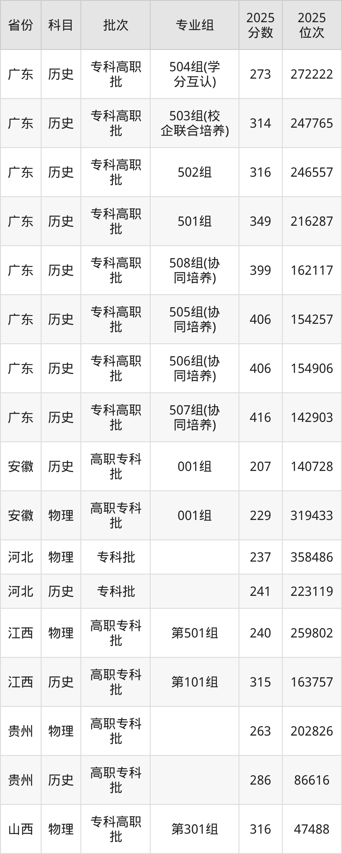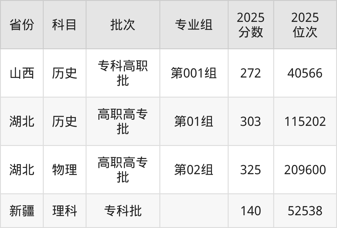 2025年在专科理科进行招生,各专业组分数线详情如下: