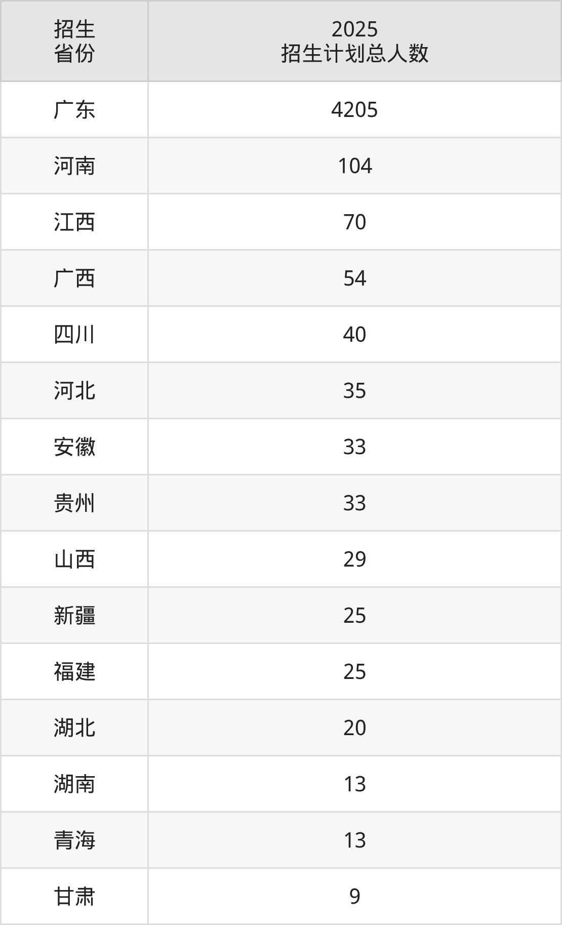 2025年广东岭南职业技术学院面向全国15个省市开展专科招生;招生专业共46个,招生人数共4708人。2025年在广东省招生计划总人数是4205人,其中,广东岭南职业技术学院在广东省招生人数最多的是护理。广东岭南职业技术学院在各省具体招生人数情况如下表。
