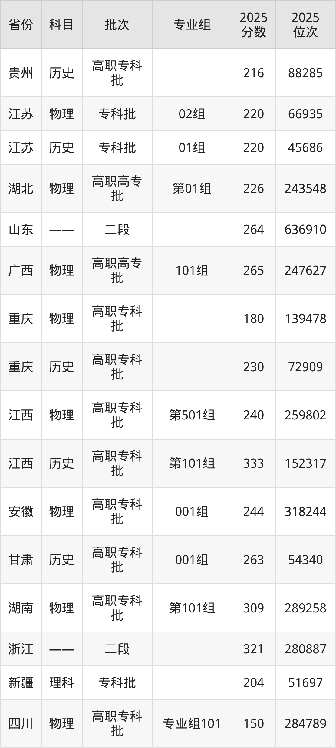 2025年在专科物理类进行招生,各专业组分数线详情如下: