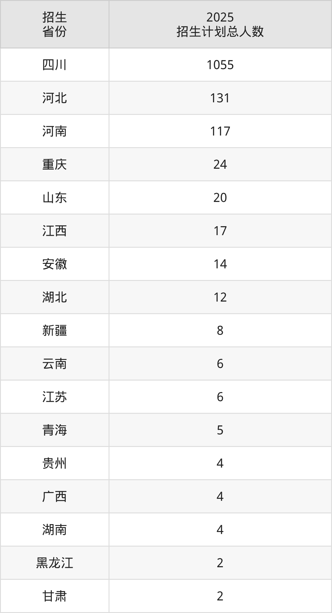 2025年四川华新现代职业学院面向全国17个省市开展专科招生;招生专业共19个,招生人数共1431人。2025年在四川省招生计划总人数是1055人,其中,四川华新现代职业学院在四川省招生人数最多的是护理。四川华新现代职业学院在各省具体招生人数情况如下表。