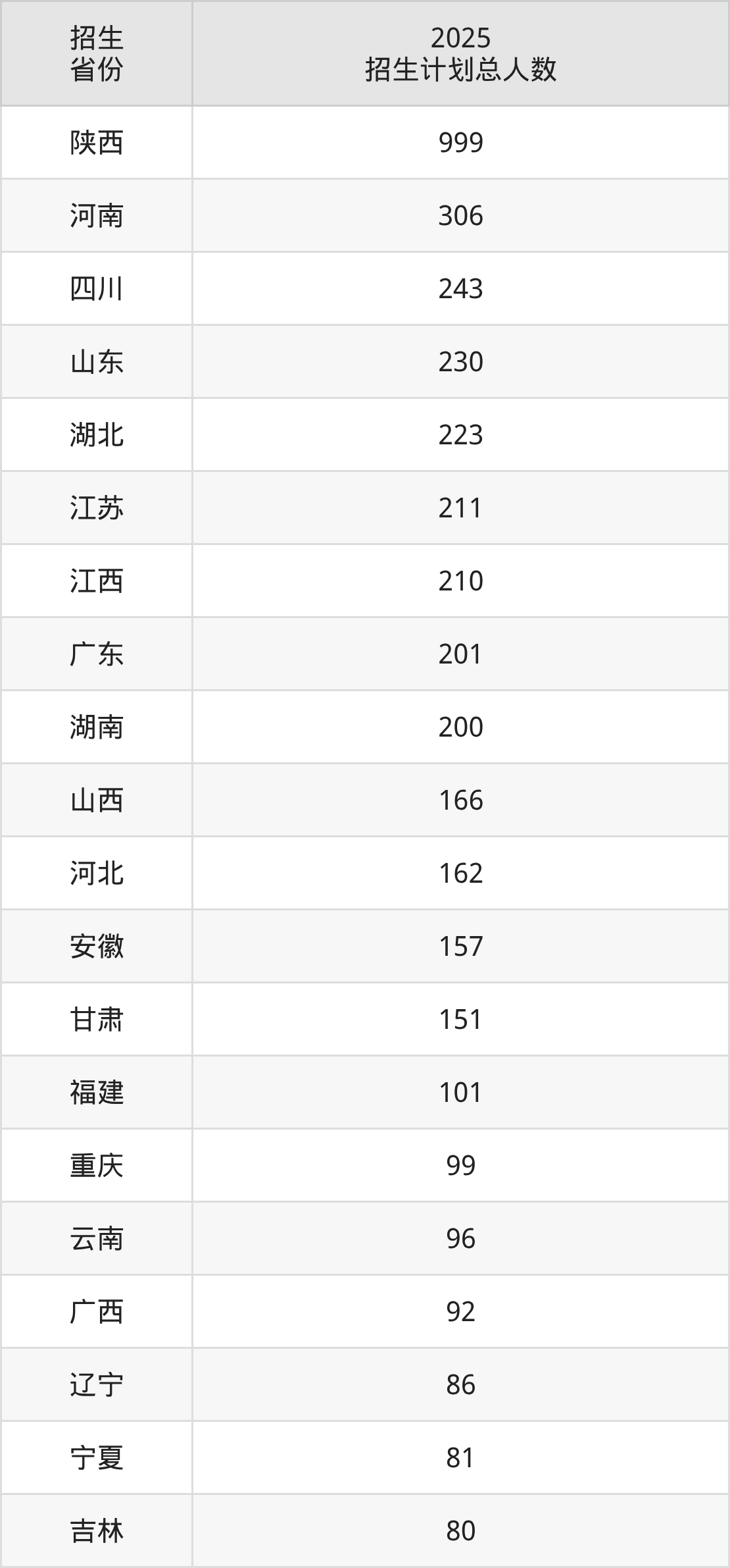 2025年西安交通大学面向全国29个省市开展本科招生;招生专业共36个,招生人数共4523人。2025年在陕西省招生计划总人数是999人,其中,西安交通大学在陕西省招生人数最多的是工科试验班。西安交通大学在各省具体招生人数情况如下表。