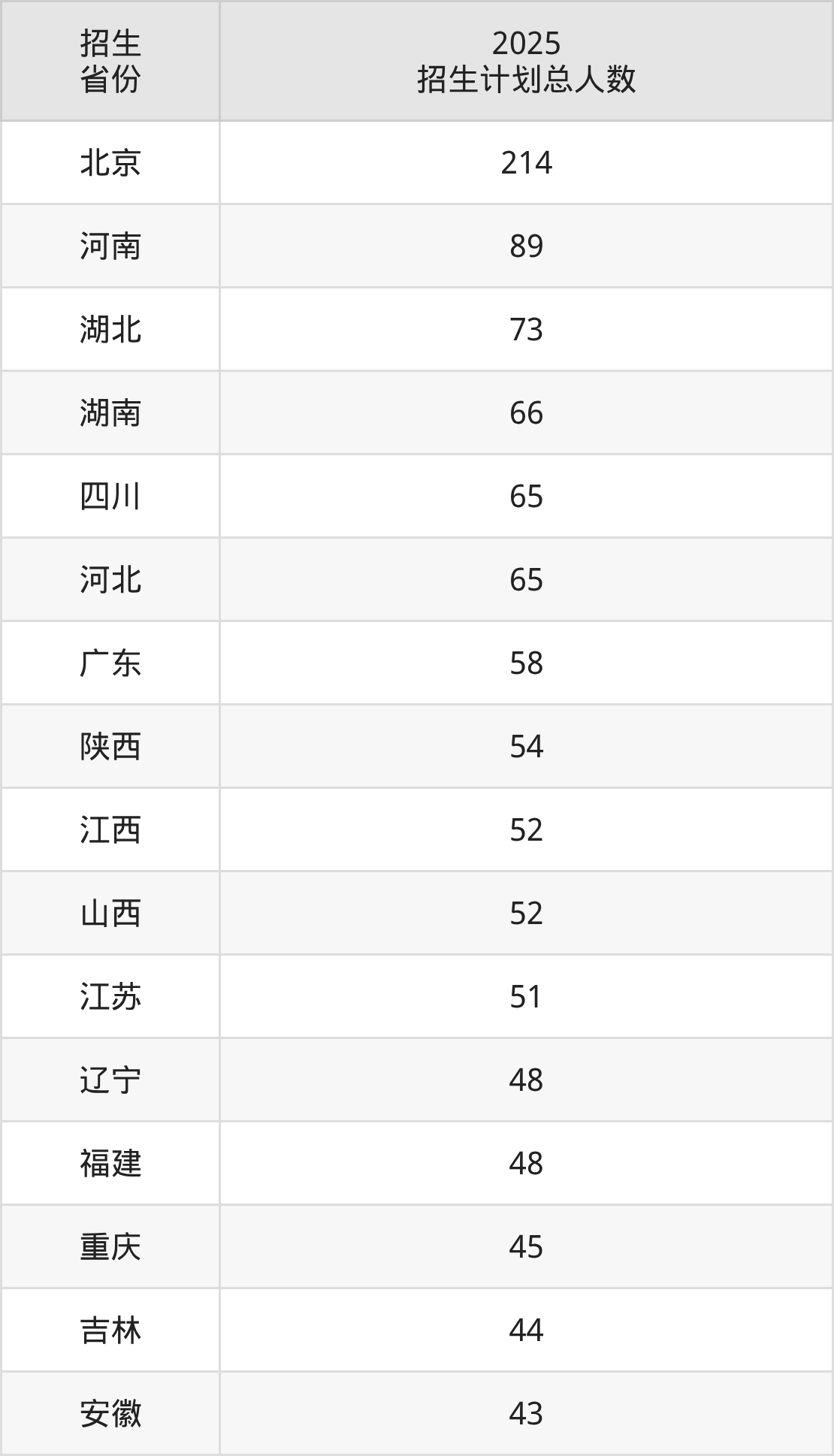2025年北京大学面向全国27个省市开展本科招生;招生专业共43个,招生人数共1409人。2025年在北京市招生计划总人数是214人,其中,北京大学在北京市招生人数最多的是文科试验班类。北京大学在各省具体招生人数情况如下表。