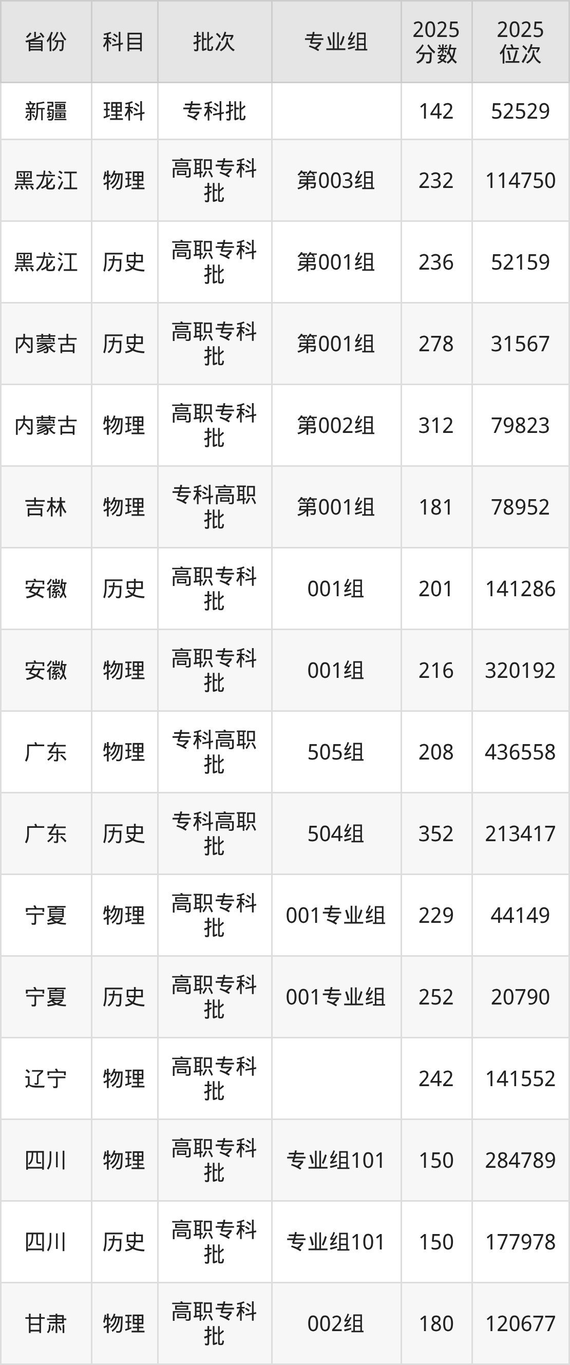 2025年在专科物理类进行招生,各专业组分数线详情如下: