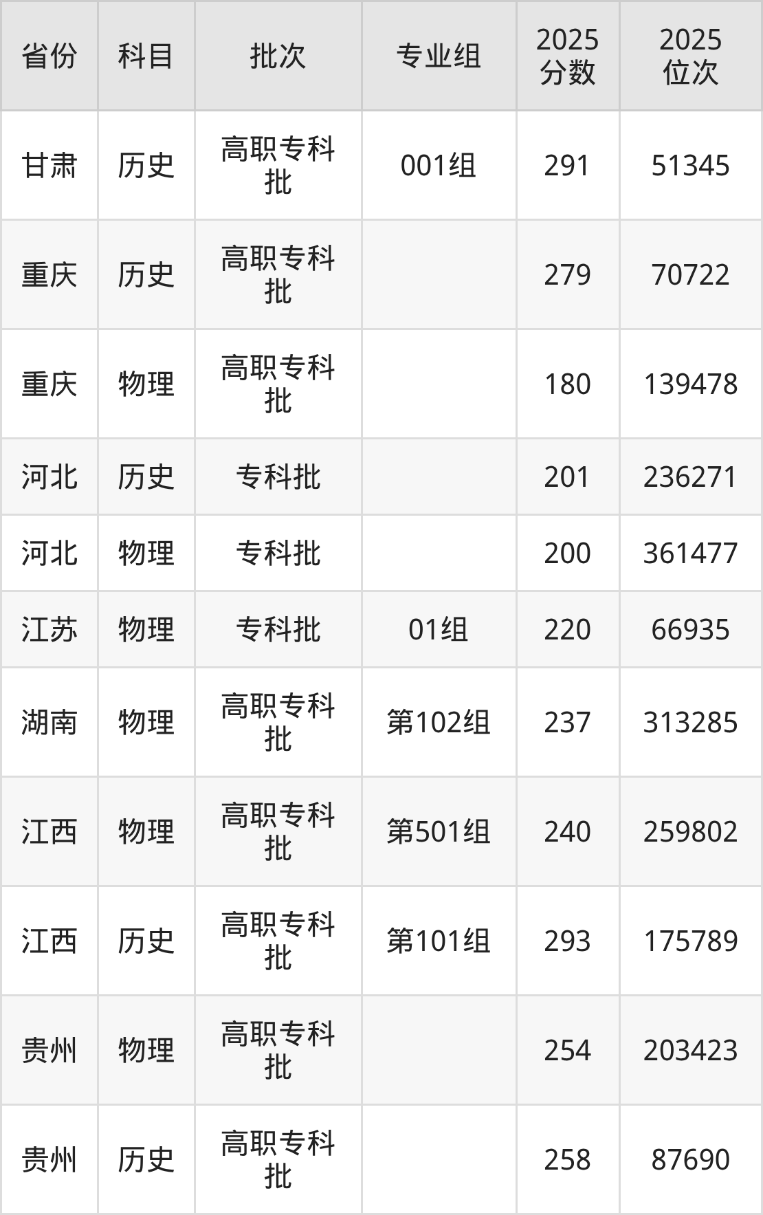 普通类专科历史类最低291分,专科物理类最低180分