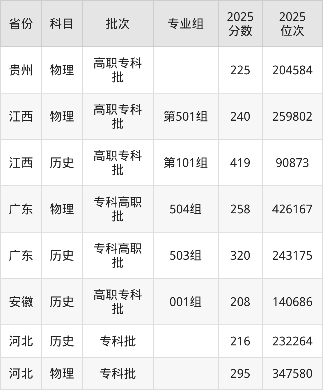 2025年在专科物理类进行招生,各专业组分数线详情如下: