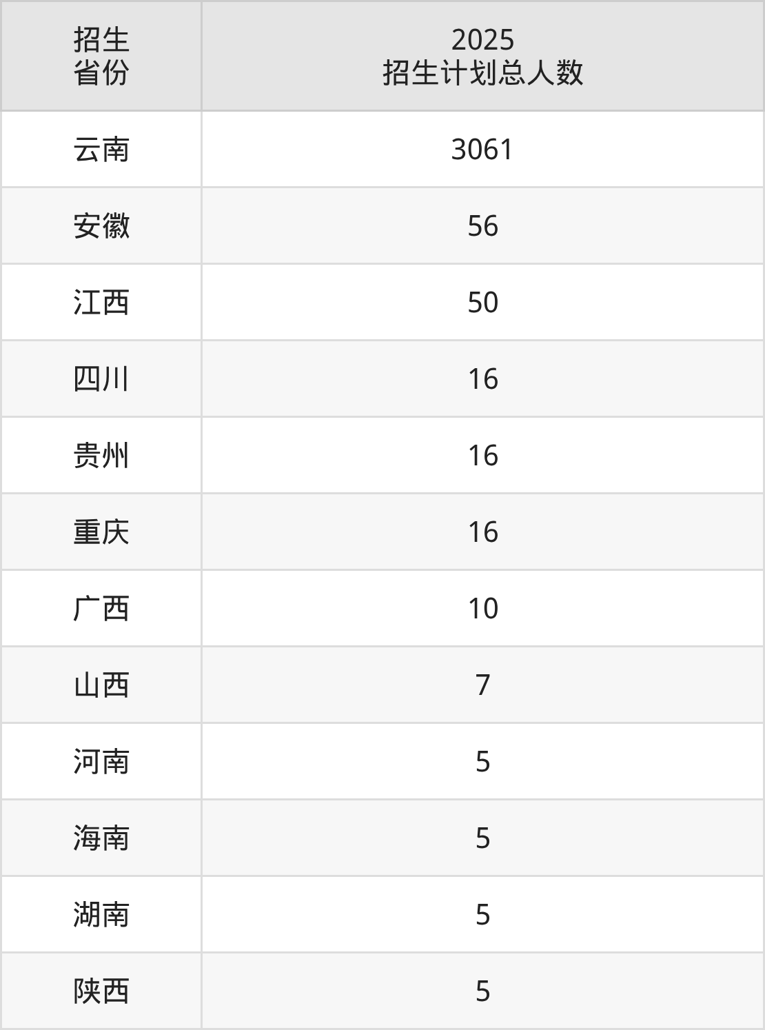 2025年昭通学院面向全国12个省市开展本科招生;招生专业共29个,招生人数共3252人。2025年在云南省招生计划总人数是3061人,其中,昭通学院在云南省招生人数最多的是数学与应用数学。昭通学院在各省具体招生人数情况如下表。