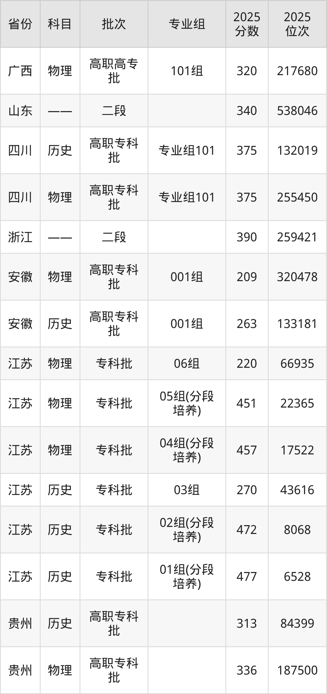 2025年在专科物理类进行招生,各专业组分数线详情如下: