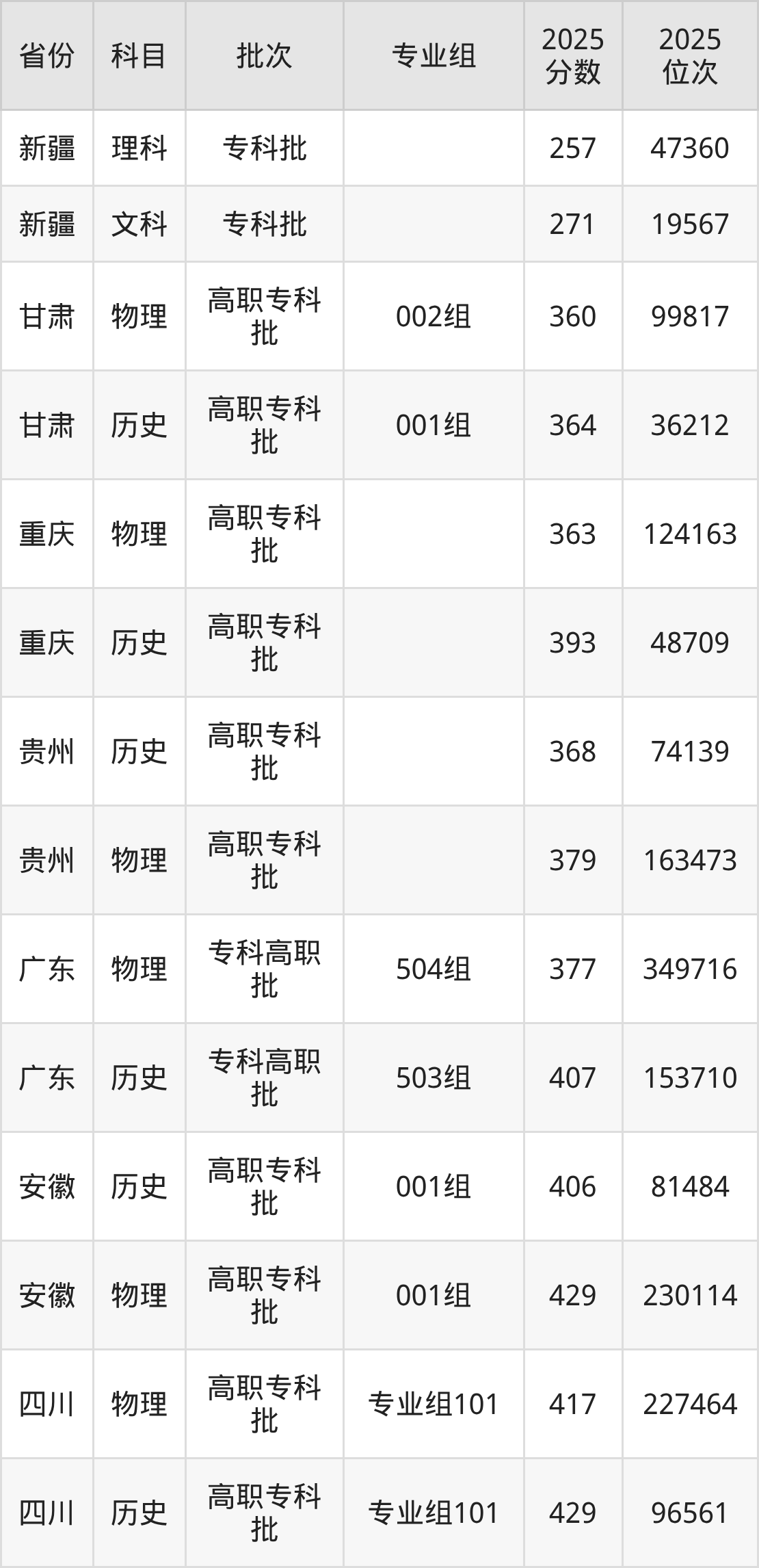 2025年四川化工职业技术学院全国录取分数线是257分到429分,录取最低在新疆理科、录取最高在安徽物理类(001组)。各省各专业组最低分具有差异,详情如下: