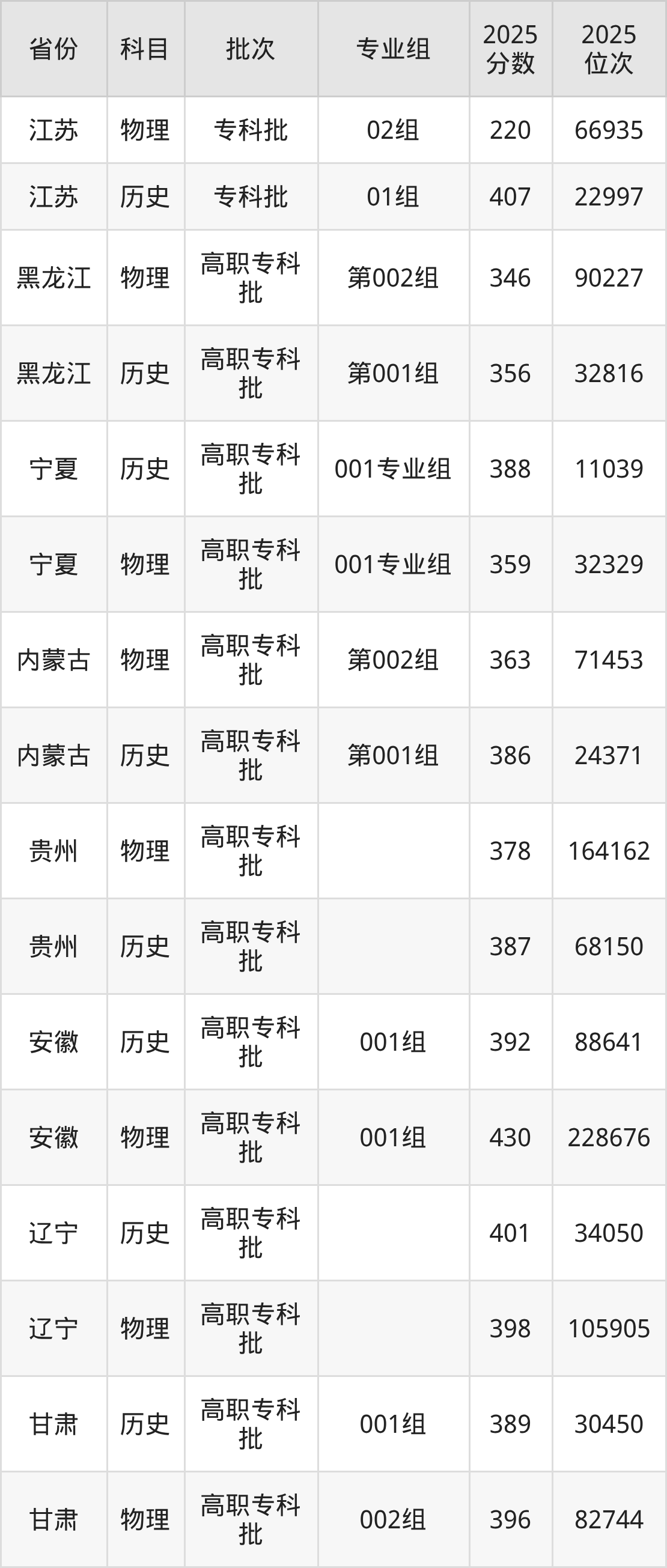 普通类专科物理类最低389分,专科历史类最低405分