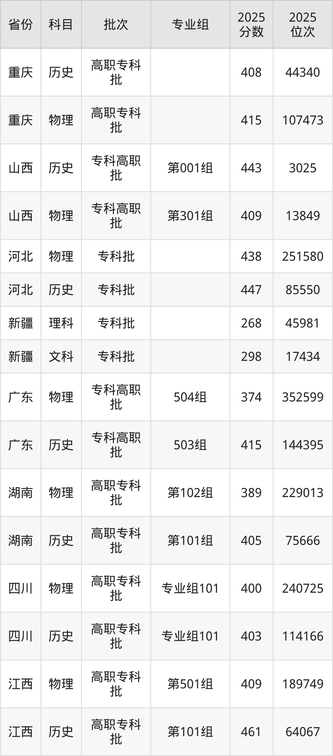 普通类专科物理类最低409分,专科历史类最低461分
