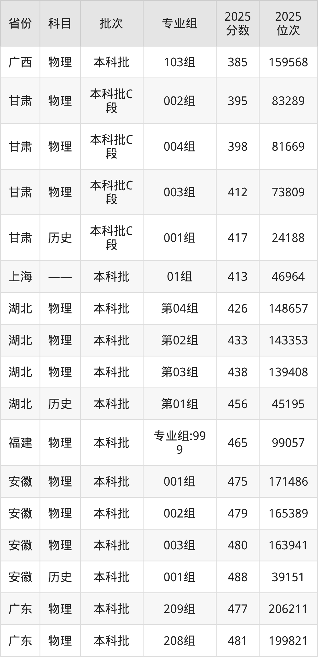 武汉纺织大学外经贸学院第004组:2025年投档录取最低分为409分,录取最低位次为58500名。