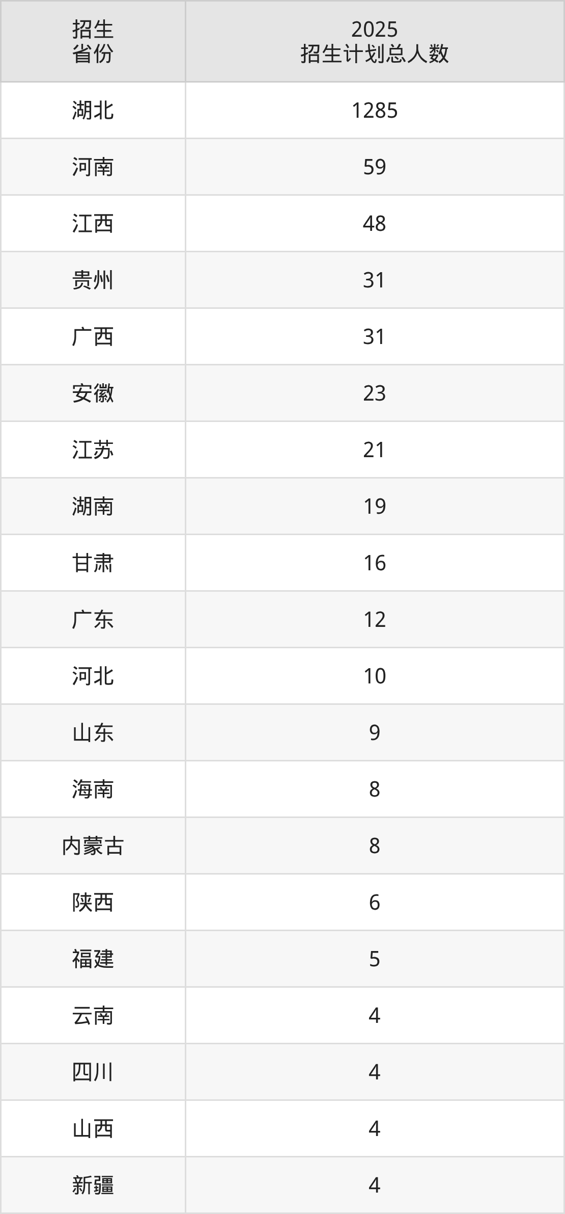 2025年武汉纺织大学外经贸学院面向全国23个省市开展本科招生;招生专业共21个,招生人数共1616人。2025年在湖北省招生计划总人数是1285人,其中,武汉纺织大学外经贸学院在湖北省招生人数最多的是电子信息工程。武汉纺织大学外经贸学院在各省具体招生人数情况如下表。