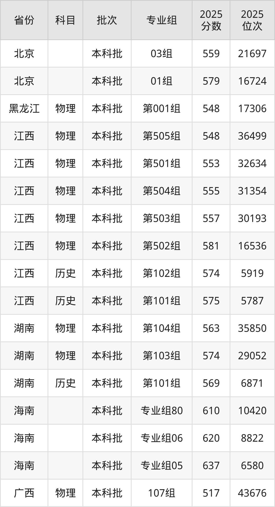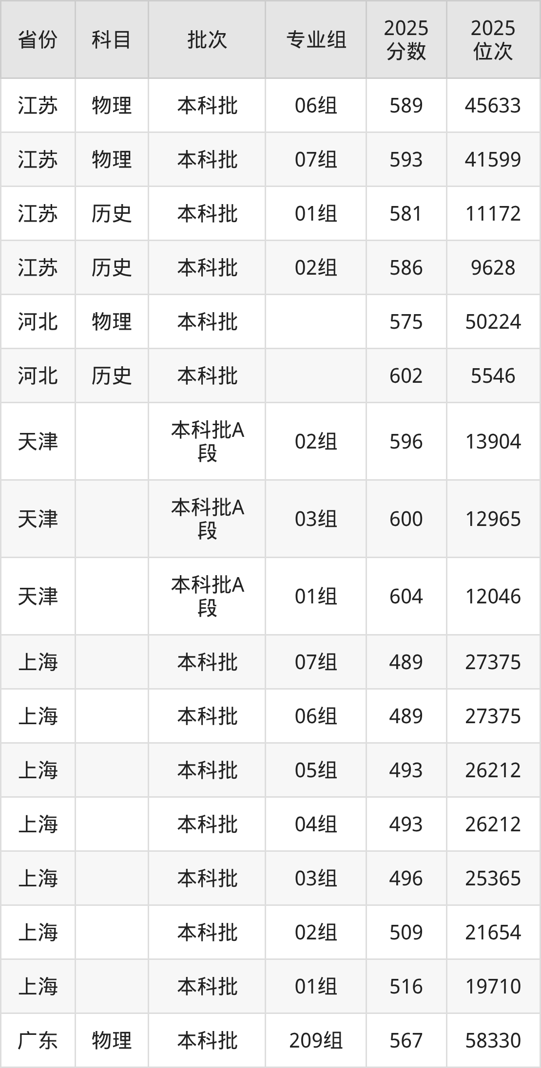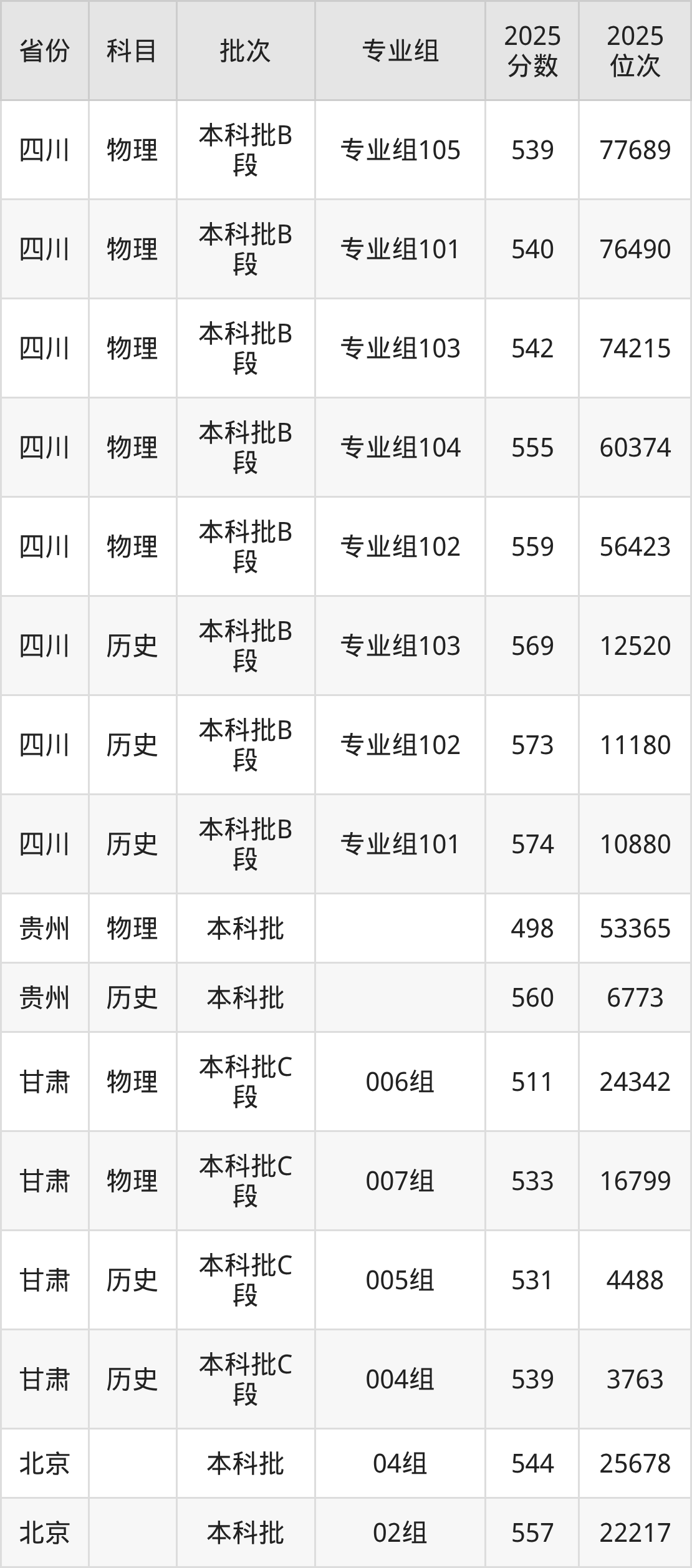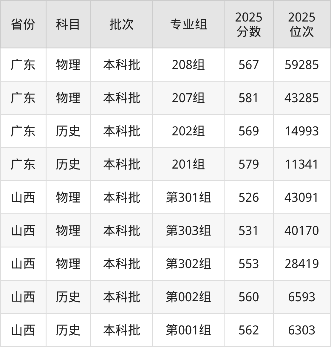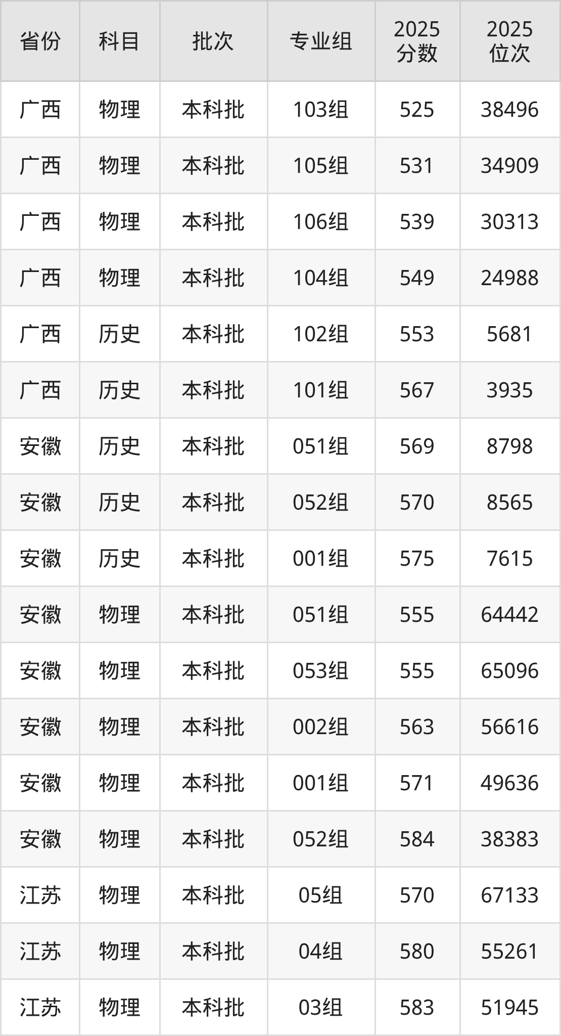 2025年在本科物理类进行招生,各专业组分数线详情如下: