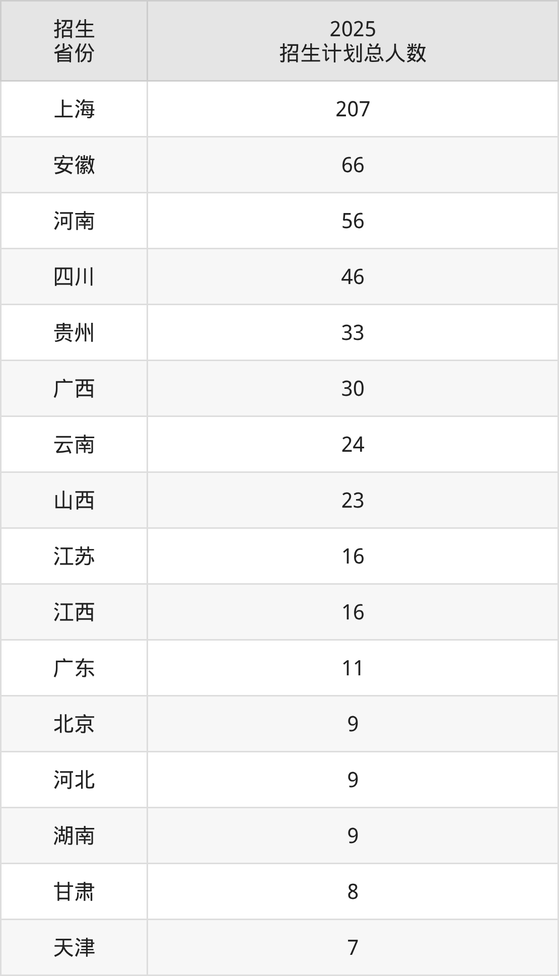 2025年上海体育大学面向全国18个省市开展本科招生;招生专业共7个,招生人数共579人。2025年在上海市招生计划总人数是207人,其中,上海体育大学在上海市招生人数最多的是医学技术类。上海体育大学在各省具体招生人数情况如下表。