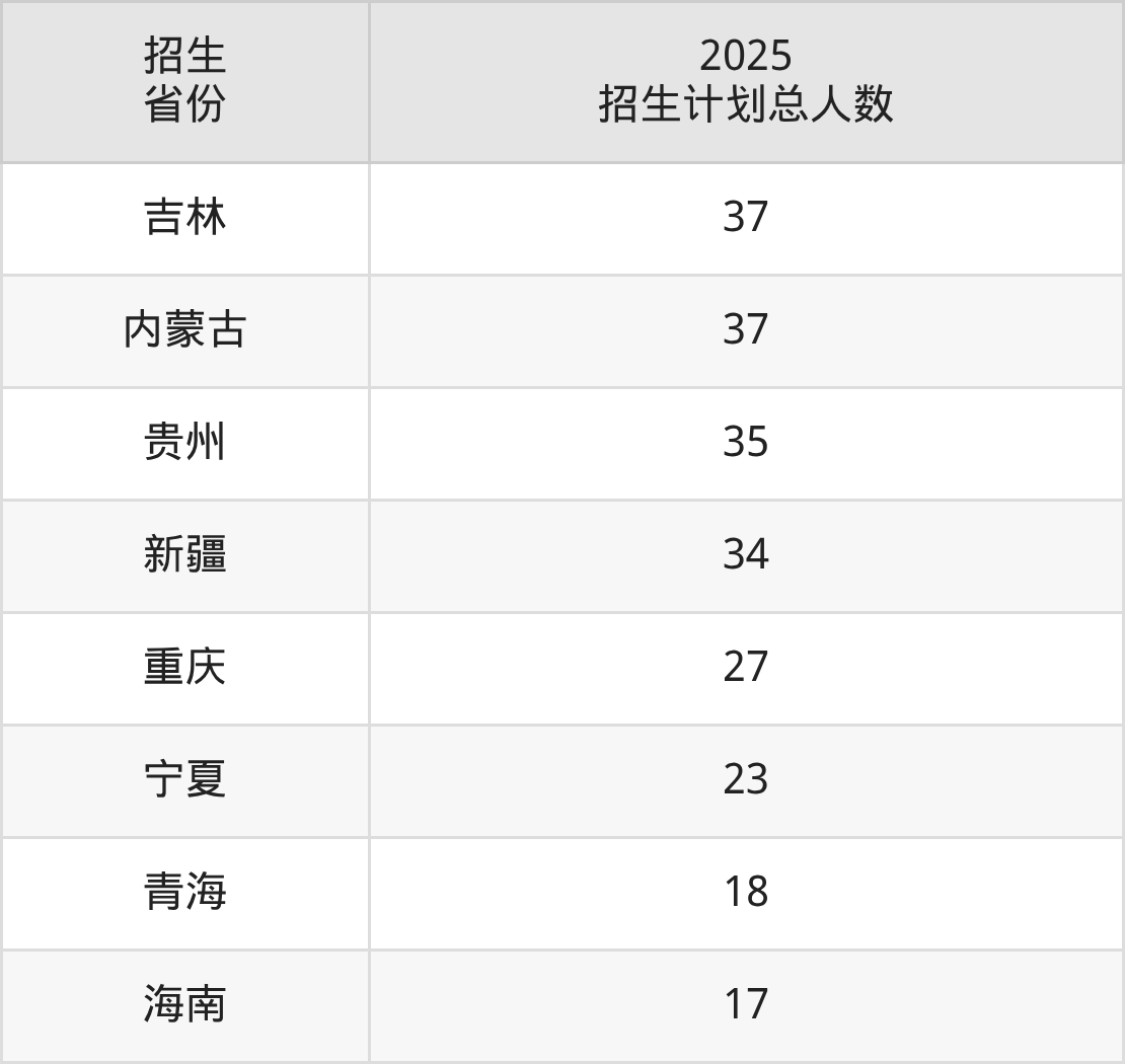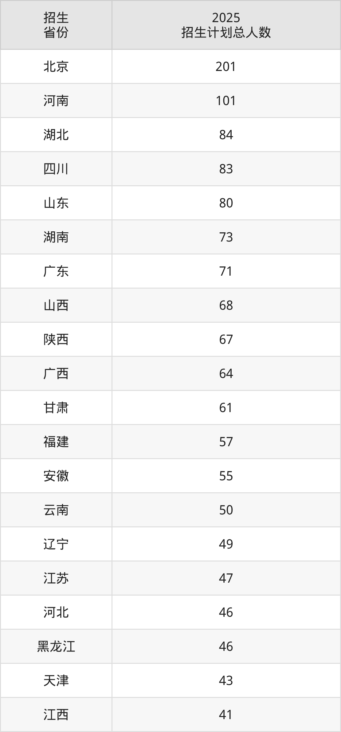 2025年清华大学面向全国28个省市开展本科招生;招生专业共13个,招生人数共1615人。2025年在北京市招生计划总人数是201人,其中,清华大学在北京市招生人数最多的是电子信息类。清华大学在各省具体招生人数情况如下表。