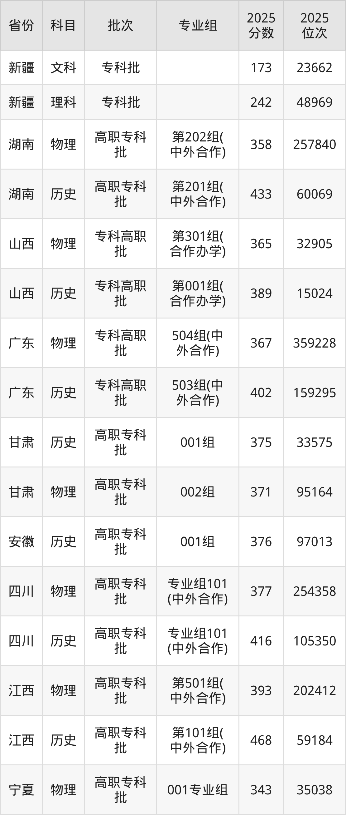 2025年海南经贸职业技术学院全国录取分数线是173分到468分,录取最低在新疆文科、录取最高在江西历史类(第101组(中外合作))。各省各专业组最低分具有差异,详情如下:
