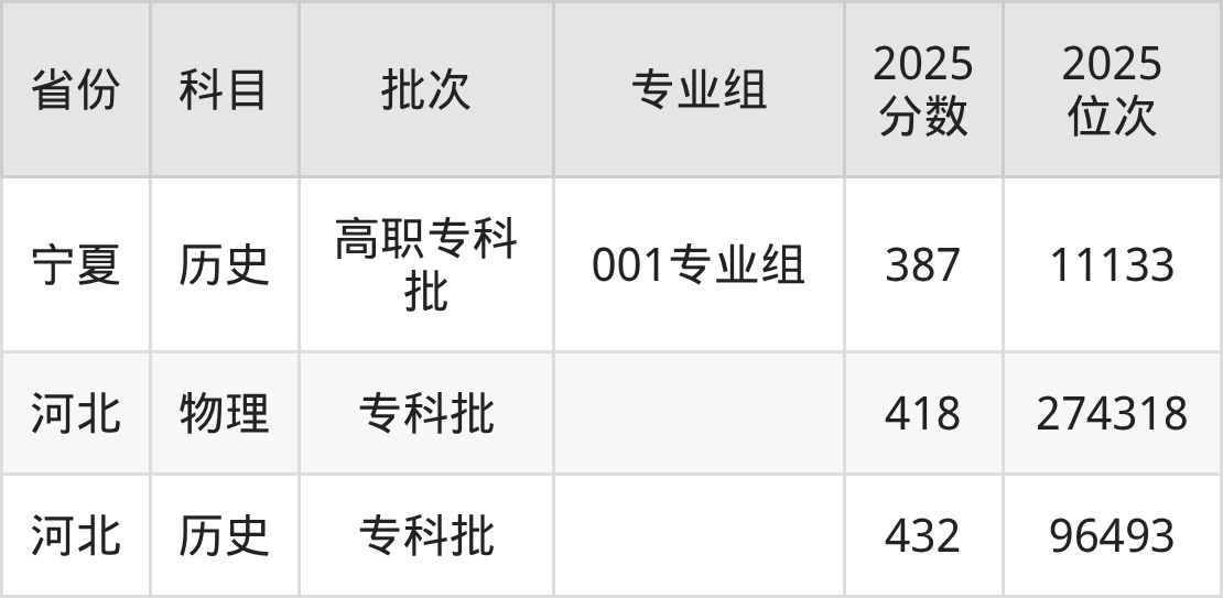 2025年在专科历史类进行招生,各专业组分数线详情如下: