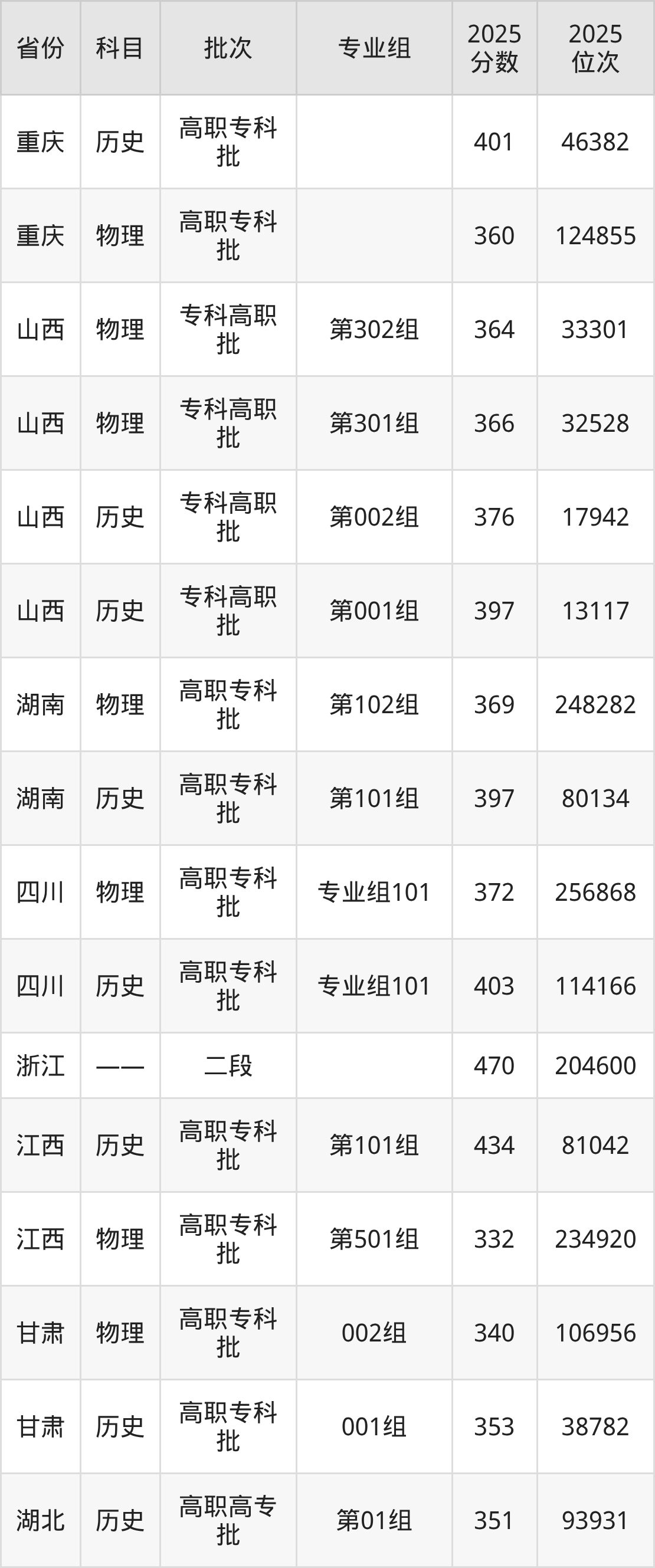 普通类专科历史类最低401分,专科物理类最低360分