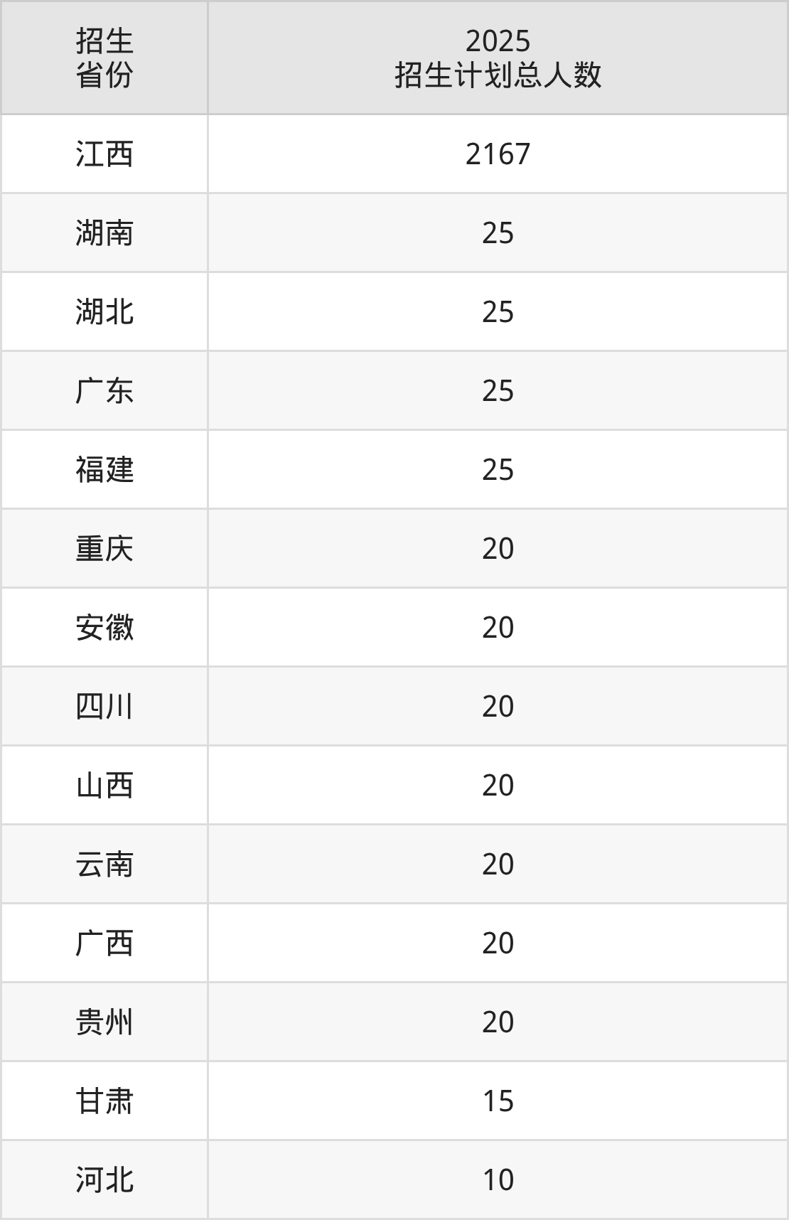 2025年南昌健康职业技术学院面向全国14个省市开展专科招生;招生专业共11个,招生人数共2432人。2025年在江西省招生计划总人数是2167人,其中,南昌健康职业技术学院在江西省招生人数最多的是护理。南昌健康职业技术学院在各省具体招生人数情况如下表。