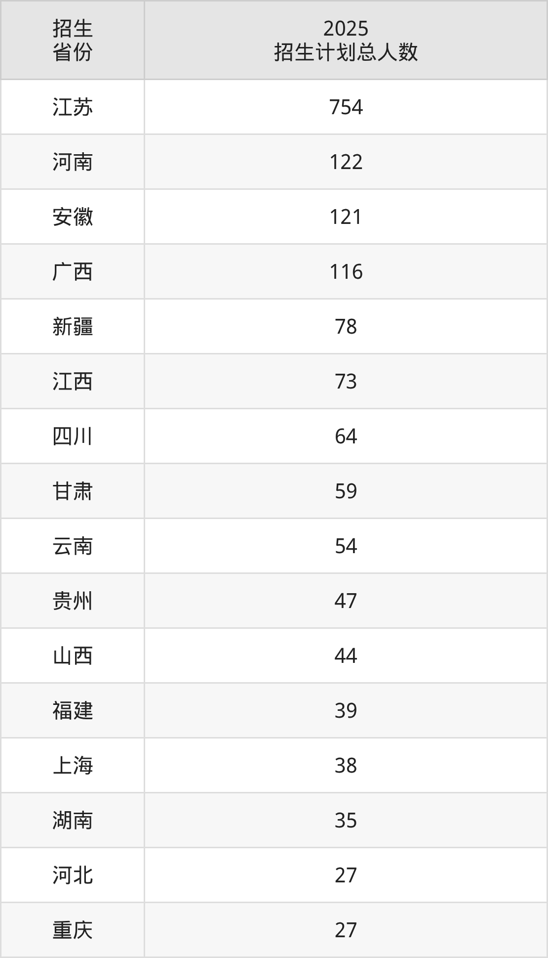 2025年南京特殊教育师范学院面向全国28个省市开展本科招生;招生专业共22个,招生人数共1896人。2025年在江苏省招生计划总人数是754人,其中,南京特殊教育师范学院在江苏省招生人数最多的是汉语言文学。南京特殊教育师范学院在各省具体招生人数情况如下表。