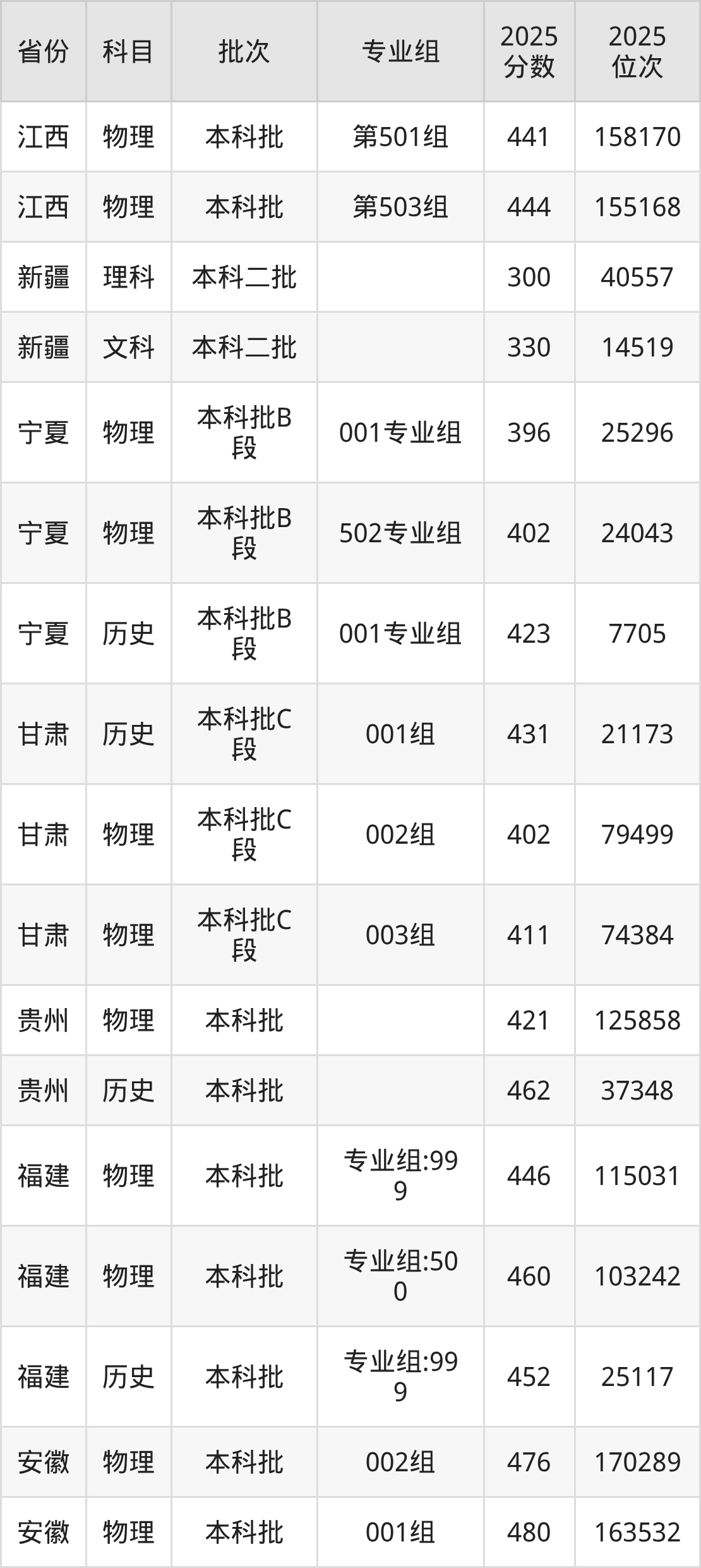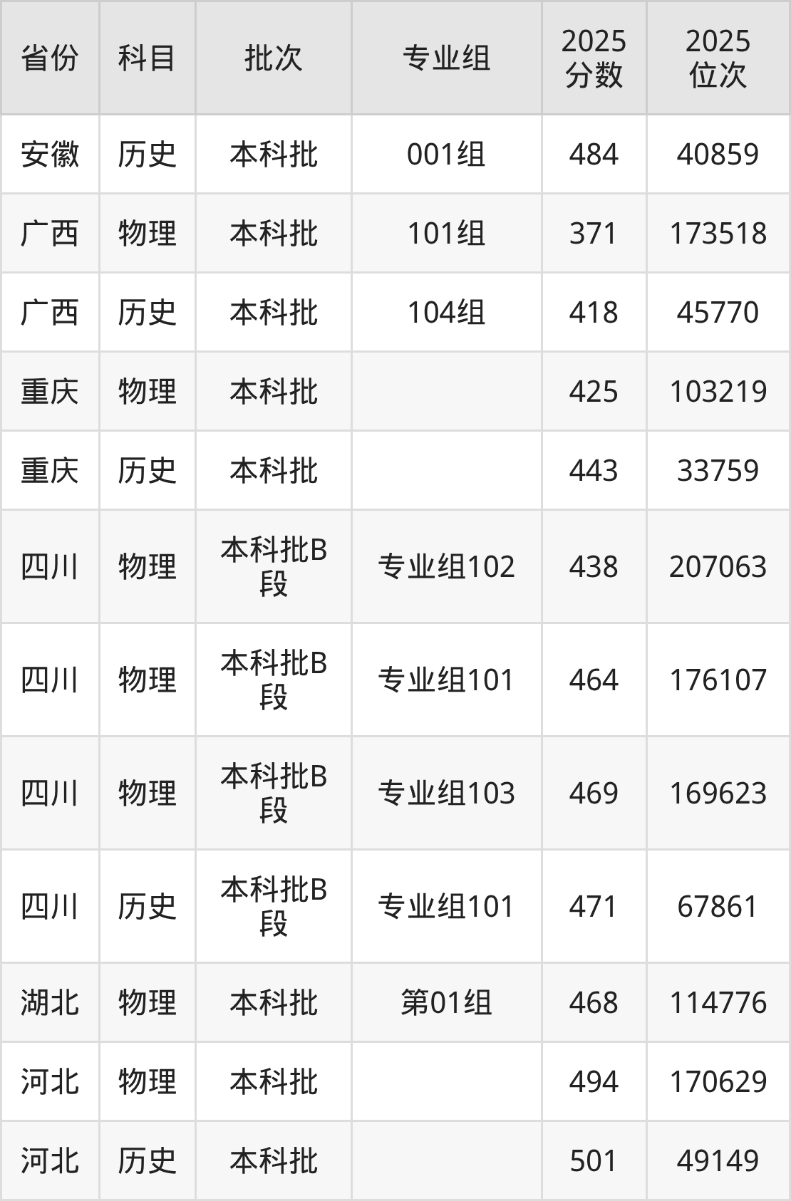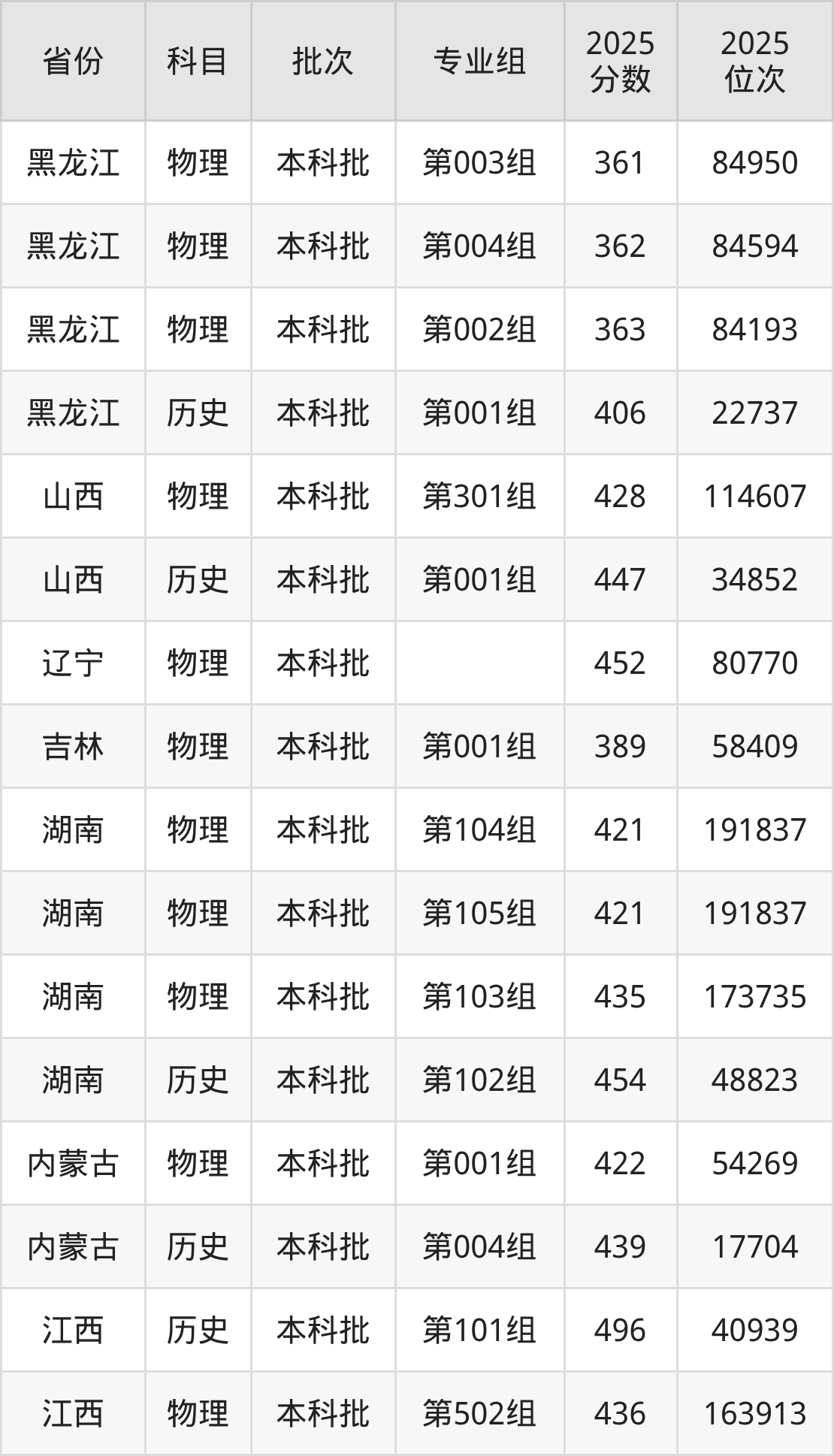 2025年在本科物理类进行招生,各专业组分数线详情如下: