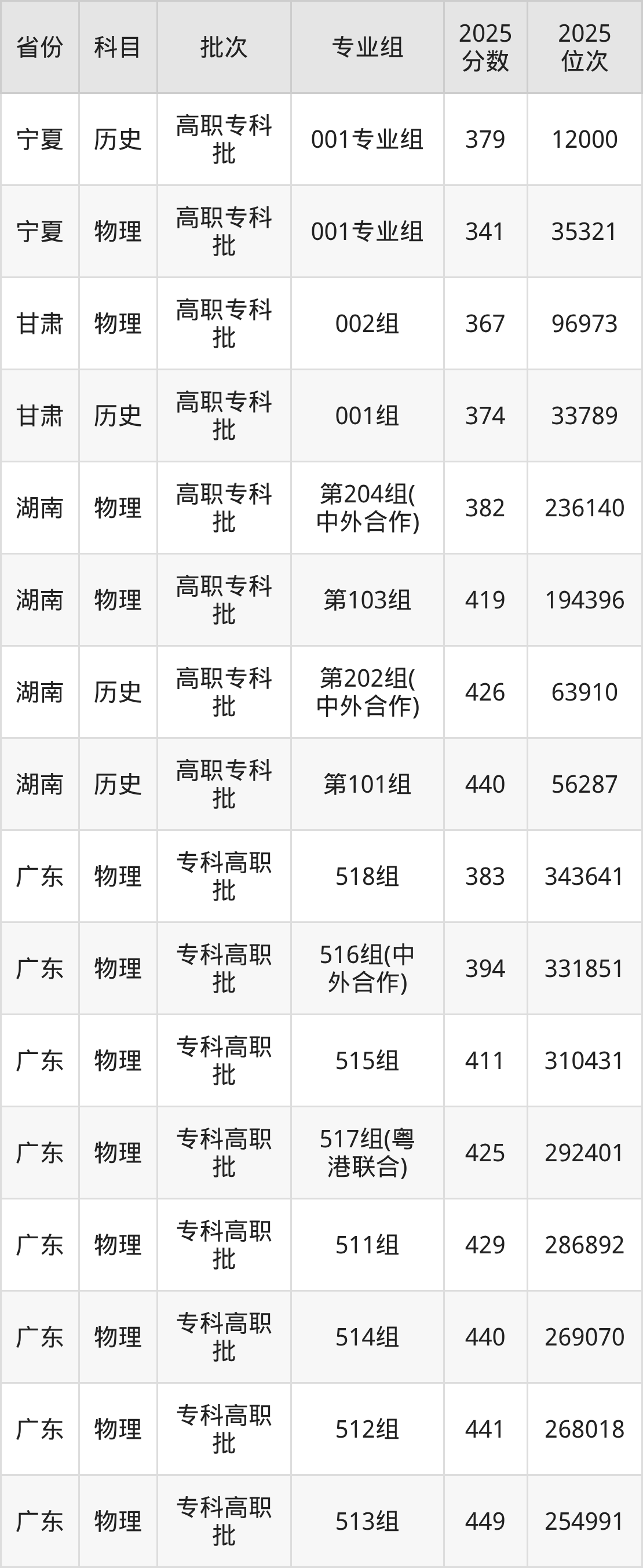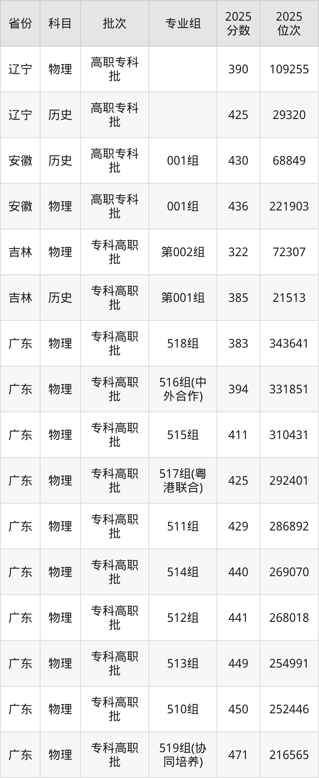 广东科学技术职业学院第001组:2025年投档录取最低分为385分,录取最低位次为15980名。