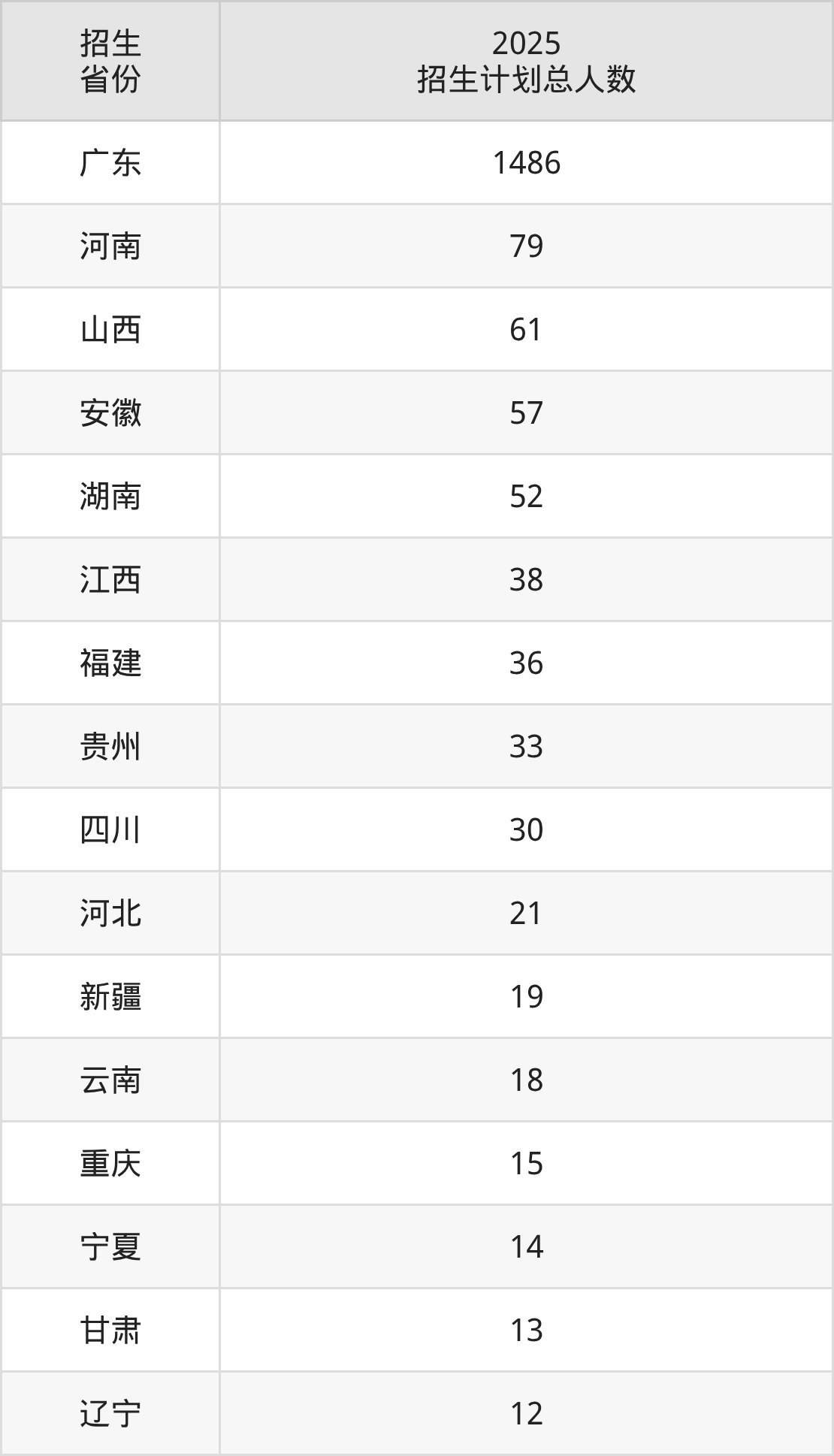 2025年广东科学技术职业学院面向全国17个省市开展专科招生;招生专业共38个,招生人数共1994人。2025年在广东省招生计划总人数是1486人,其中,广东科学技术职业学院在广东省招生人数最多的是计算机类。广东科学技术职业学院在各省具体招生人数情况如下表。