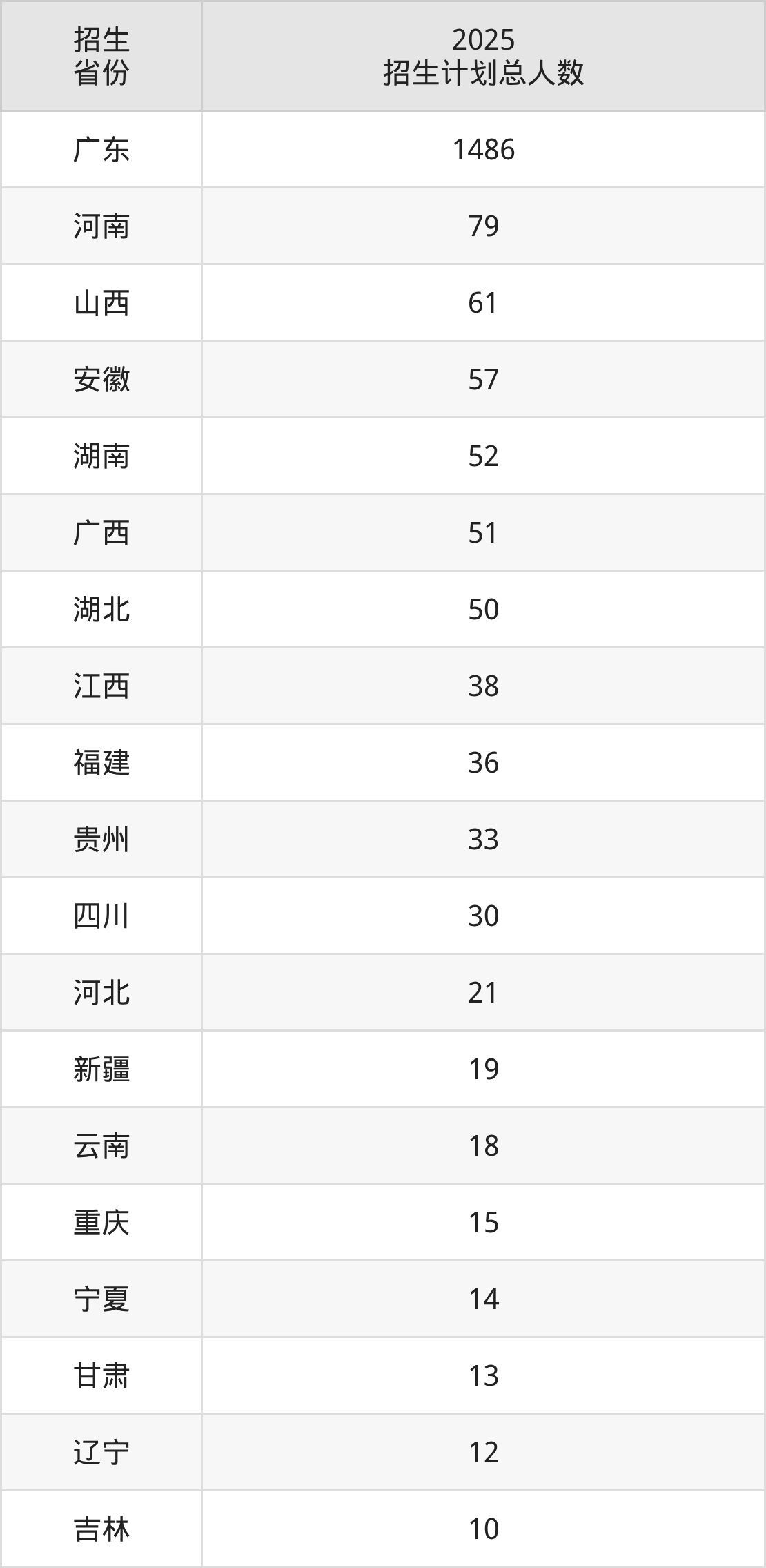 2025年广东科学技术职业学院面向全国19个省市开展专科招生;招生专业共38个,招生人数共2095人。2025年在广东省招生计划总人数是1486人,其中,广东科学技术职业学院在广东省招生人数最多的是计算机类。广东科学技术职业学院在各省具体招生人数情况如下表。