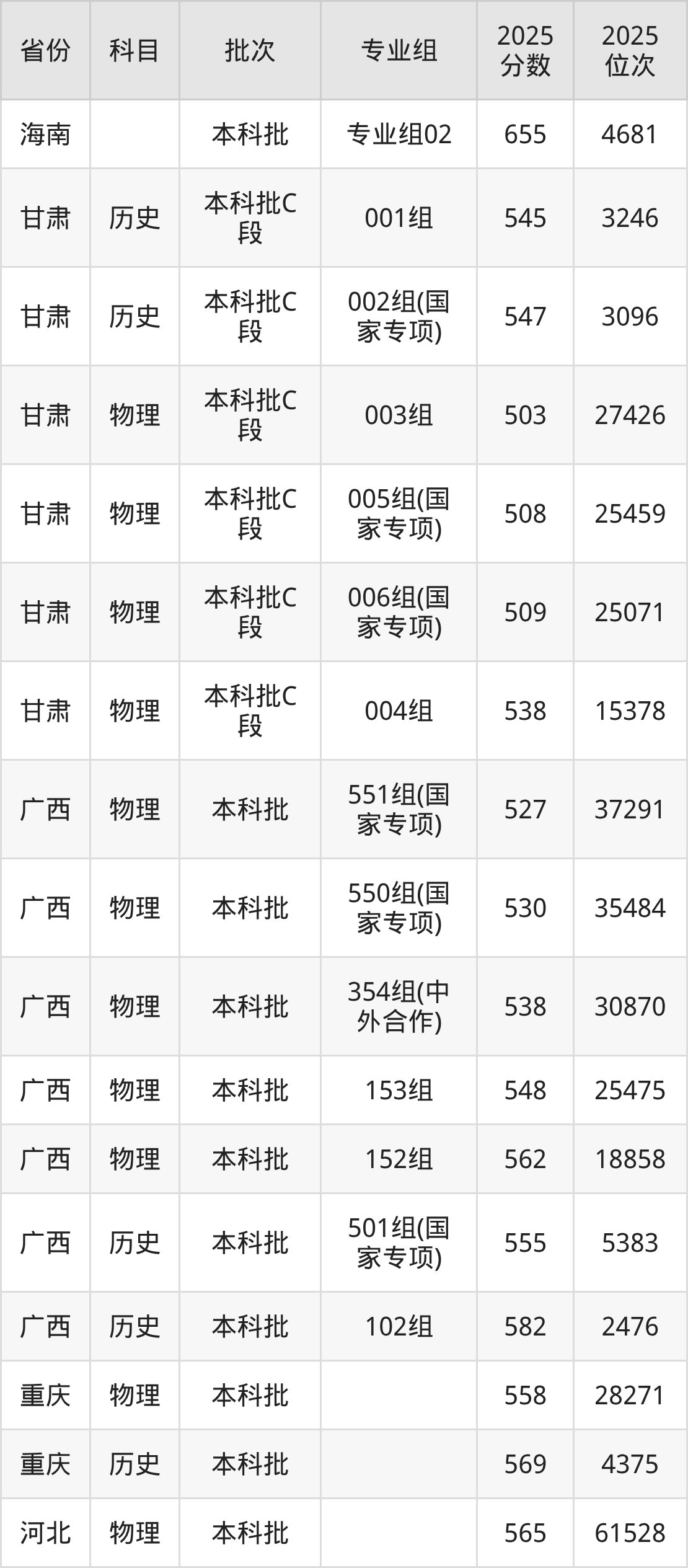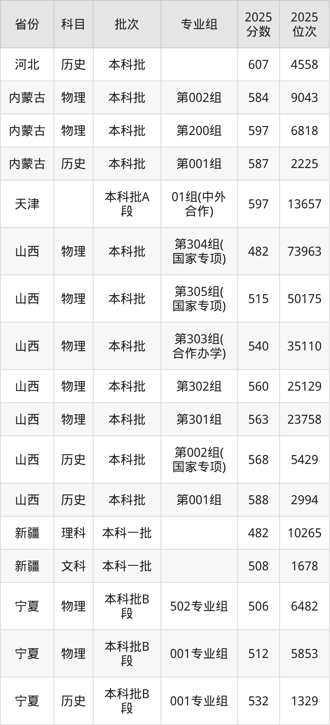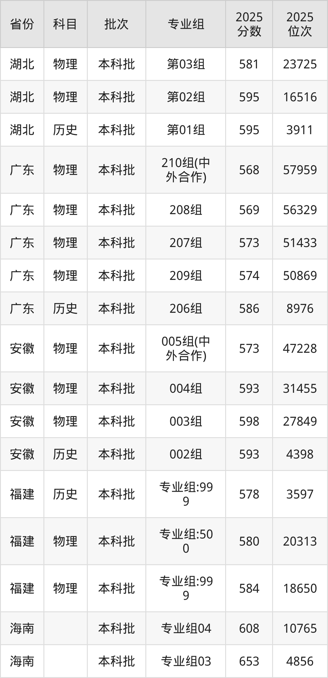 2025年在本科物理类进行招生,各专业组分数线详情如下: