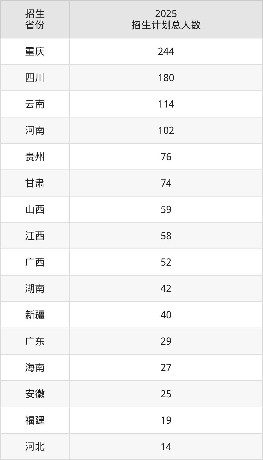 2025年西南大学(荣昌校区)面向全国25个省市开展本科招生;招生专业共7个,招生人数共1214人。2025年在重庆市招生计划总人数是244人,其中,西南大学(荣昌校区)在重庆市招生人数最多的是动物医学类。西南大学(荣昌校区)在各省具体招生人数情况如下表。