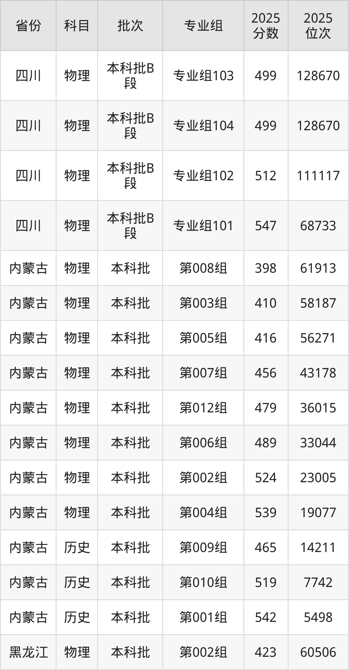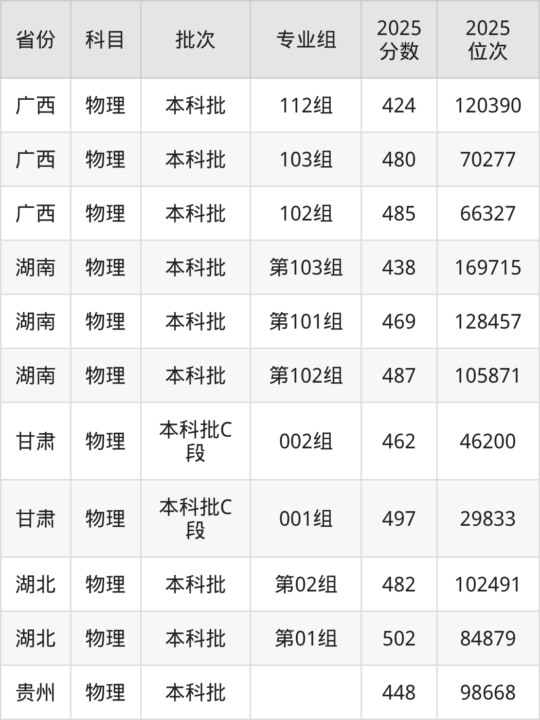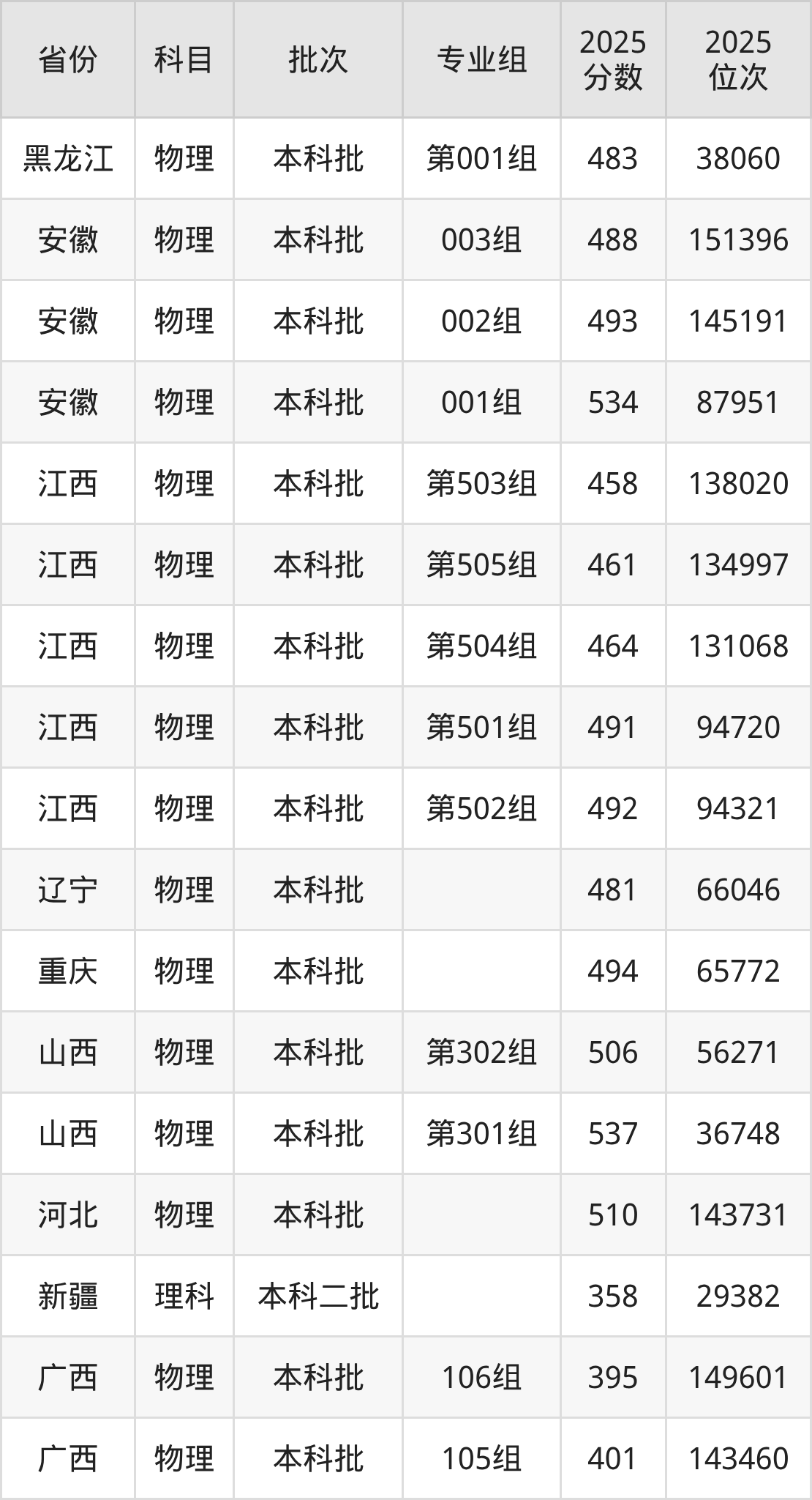 2025年在本科物理类进行招生,各专业组分数线详情如下: