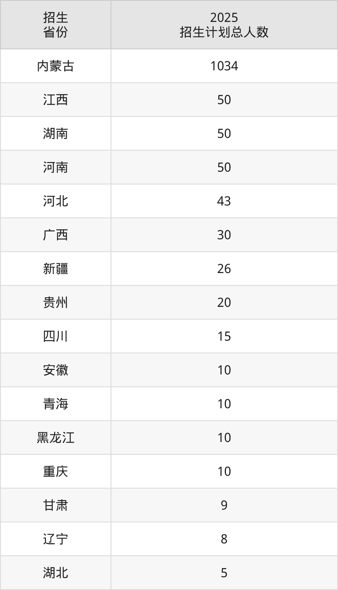 2025年内蒙古科技大学包头医学院面向全国18个省市开展本科招生;招生专业共24个,招生人数共1390人。2025年在内蒙古自治区招生计划总人数是1034人,其中,内蒙古科技大学包头医学院在内蒙古自治区招生人数最多的是临床医学。内蒙古科技大学包头医学院在各省具体招生人数情况如下表。
