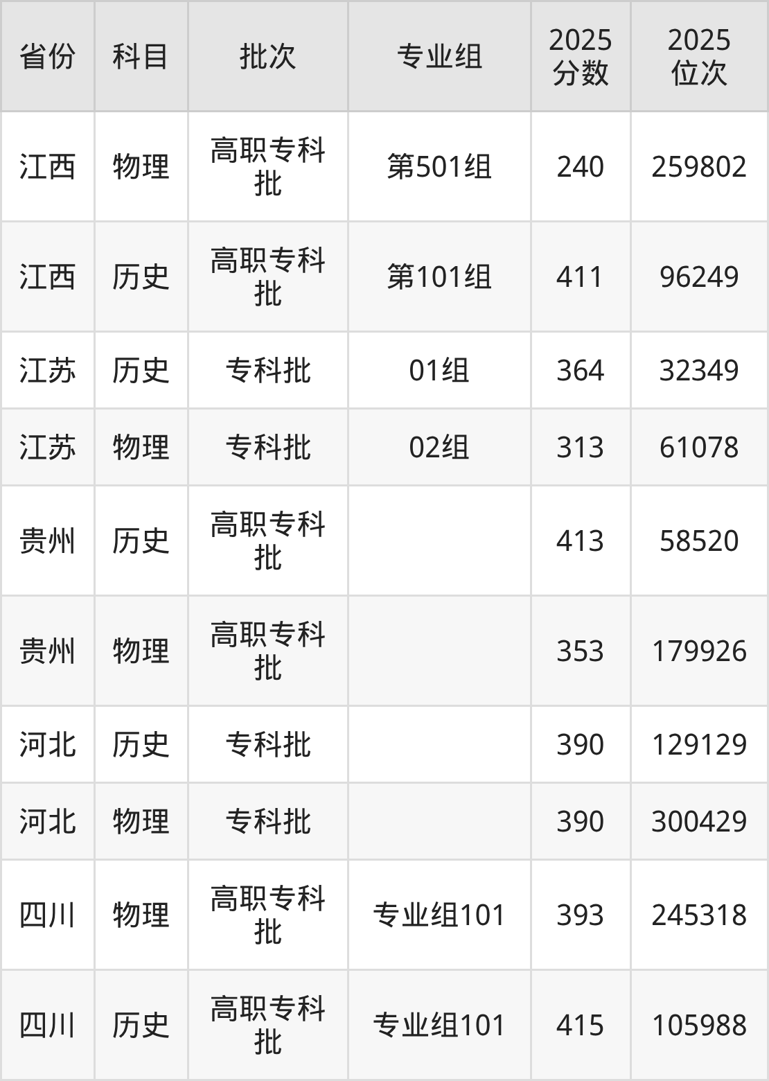 普通类专科物理类最低393分,专科历史类最低415分