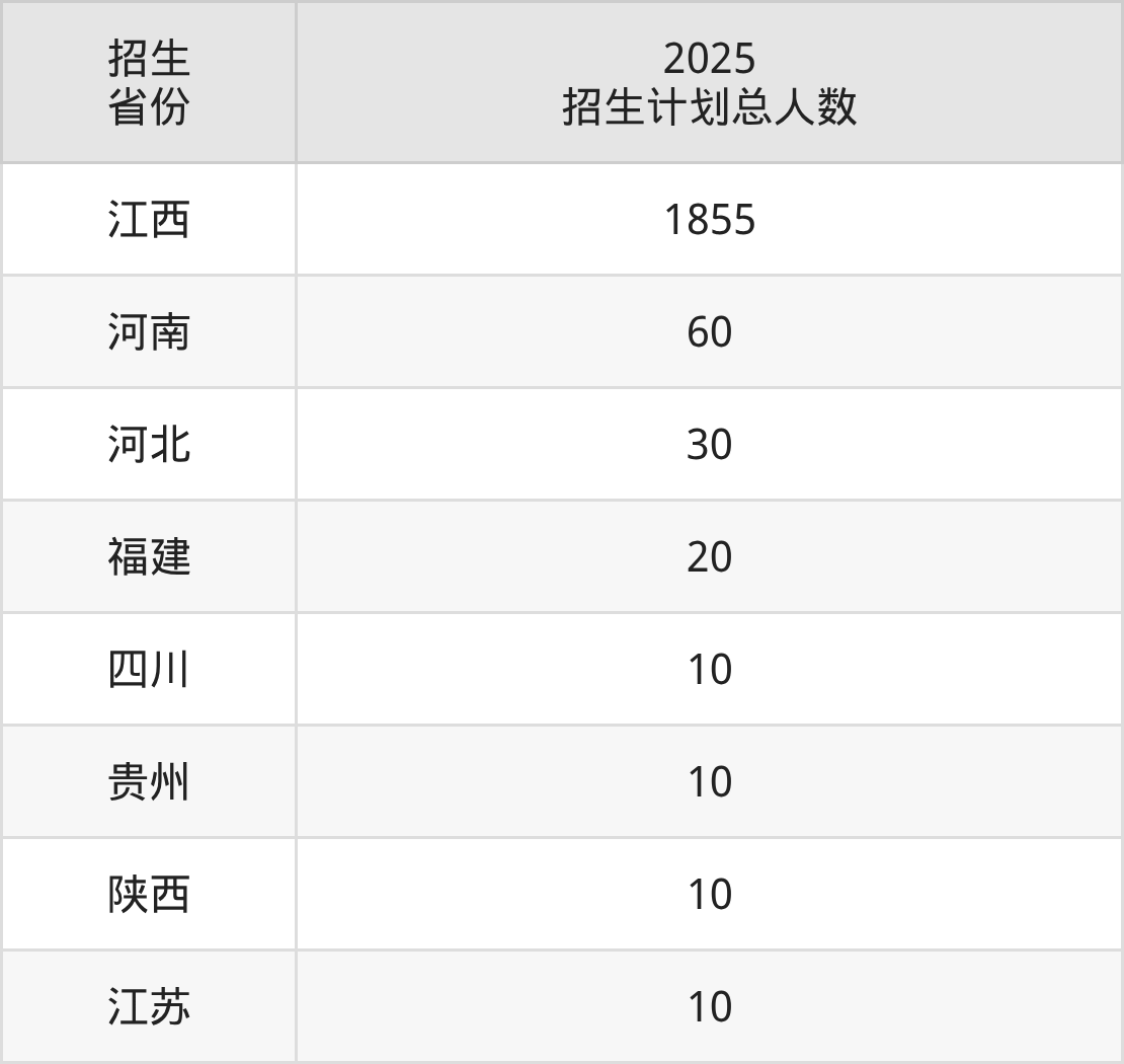 2025年江西农业工程职业学院面向全国8个省市开展专科招生;招生专业共28个,招生人数共2005人。2025年在江西省招生计划总人数是1855人,其中,江西农业工程职业学院在江西省招生人数最多的是中药学。江西农业工程职业学院在各省具体招生人数情况如下表。