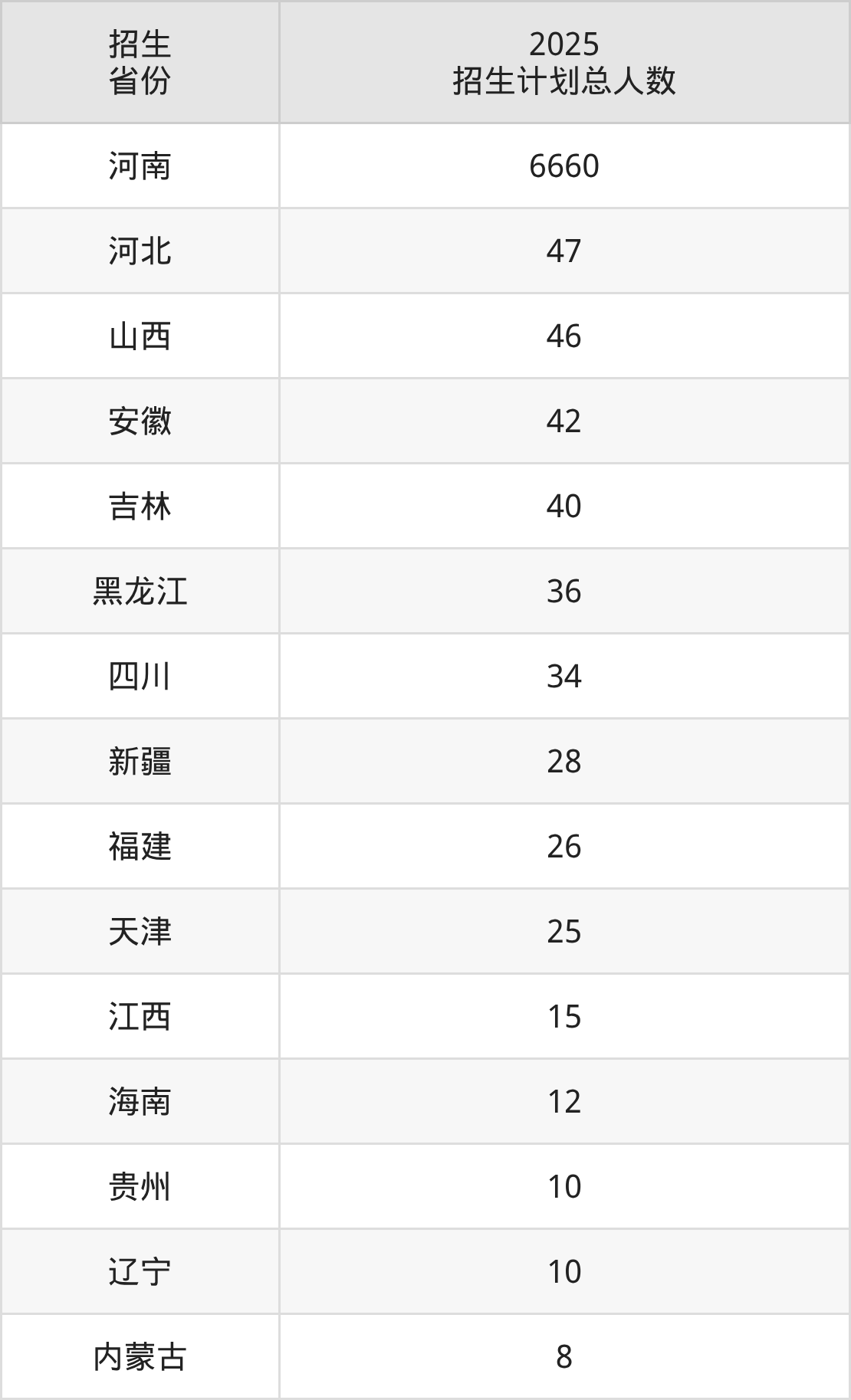 2025年郑州升达经贸管理学院面向全国15个省市开展本科招生;招生专业共43个,招生人数共5769人。2025年在河南省招生计划总人数是6660人,其中,郑州升达经贸管理学院在河南省招生人数最多的是汉语言文学。郑州升达经贸管理学院在各省具体招生人数情况如下表。