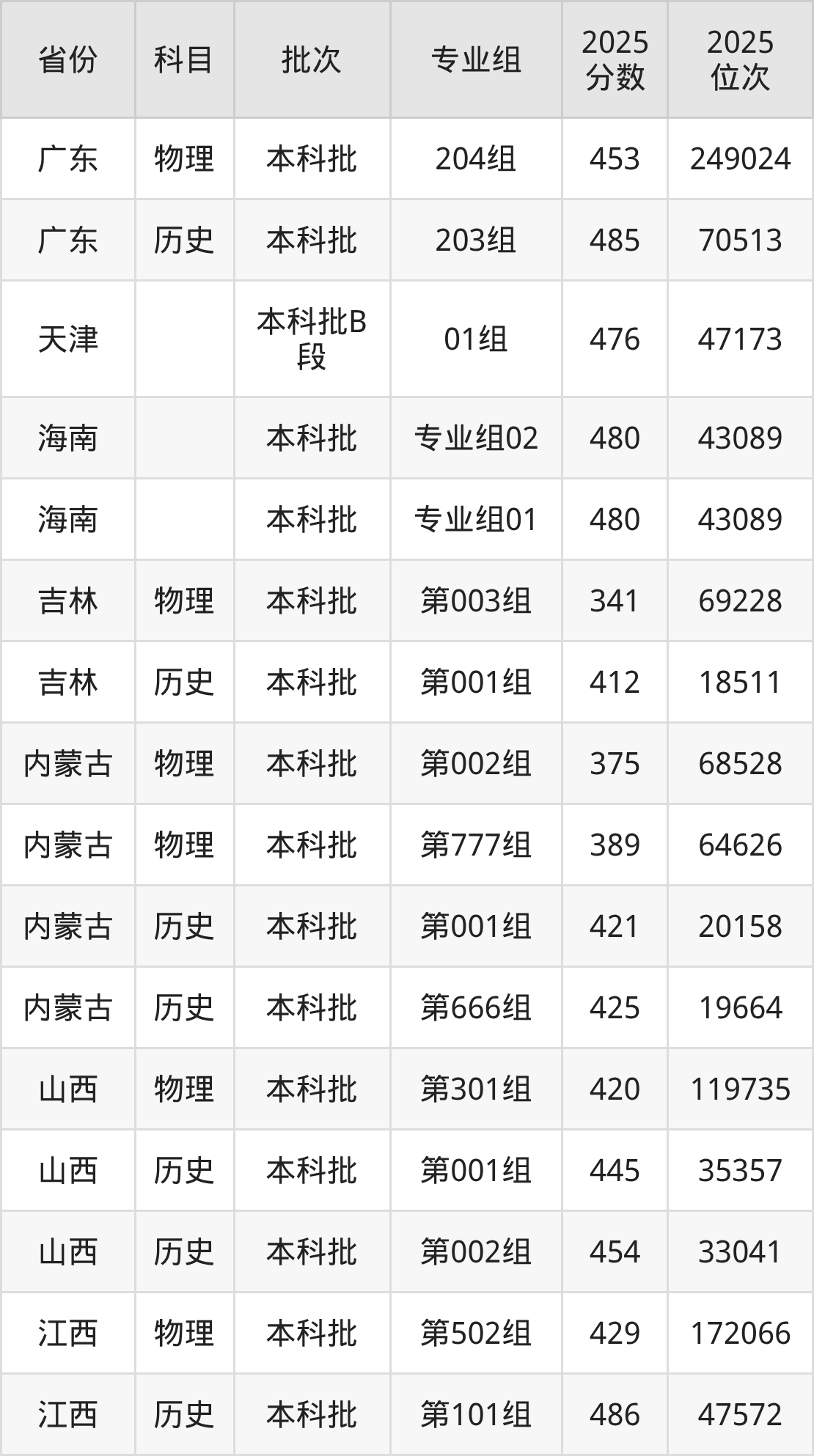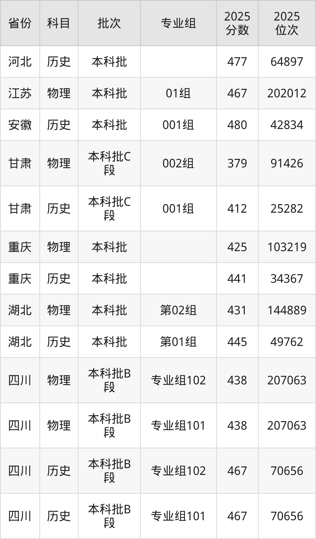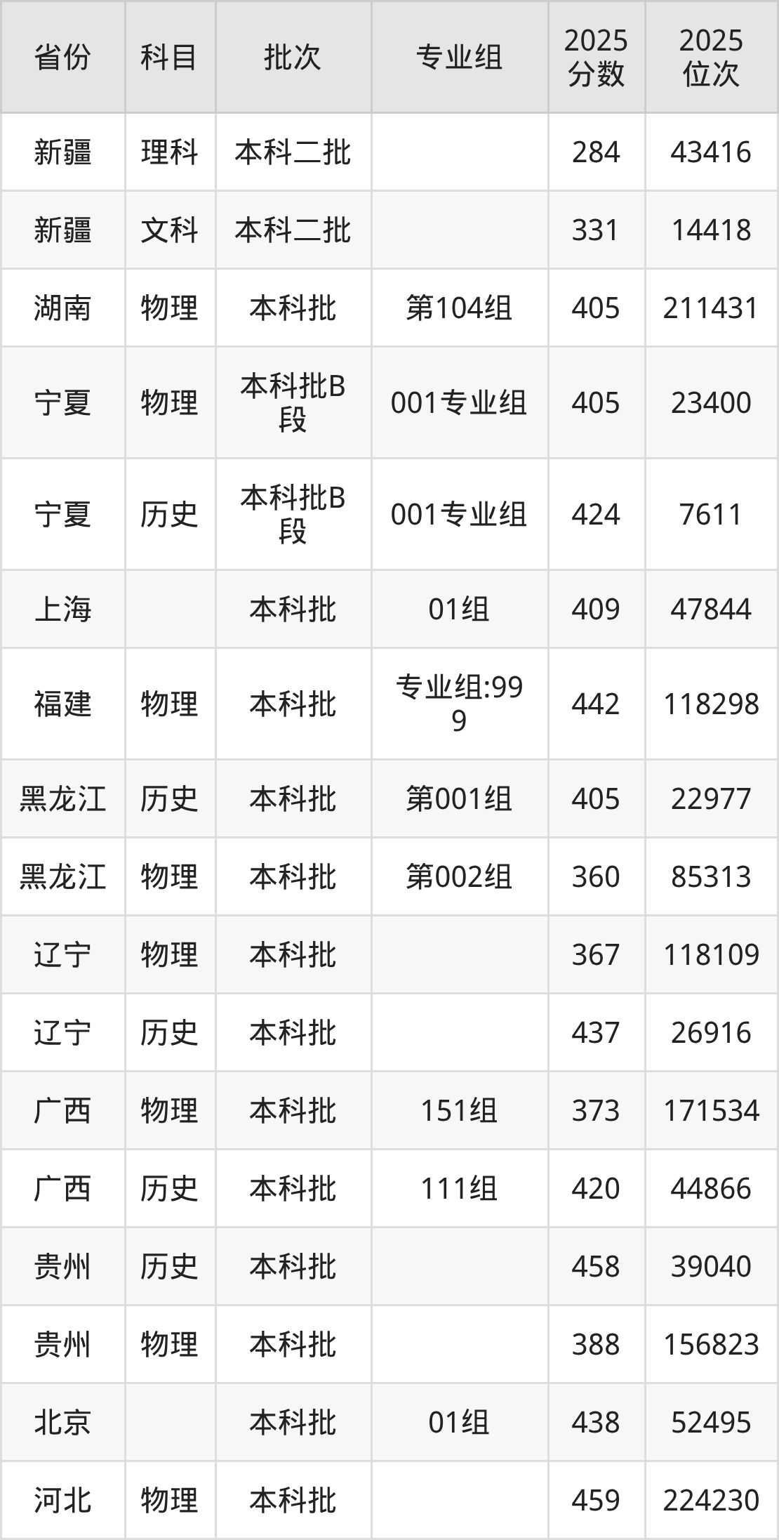 2025年投档录取最低分为425分,录取最低位次为103219名。