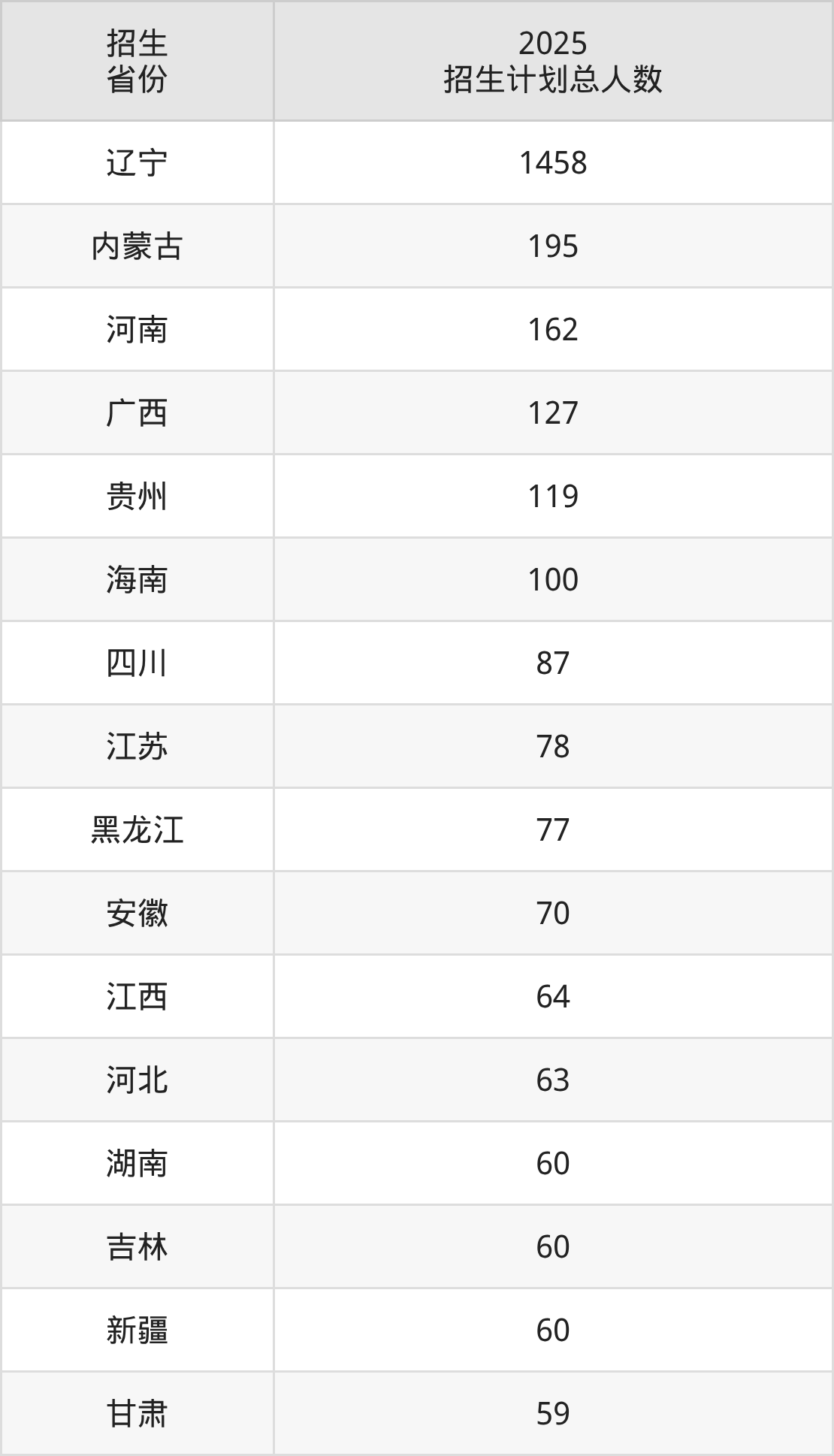 2025年辽宁对外经贸学院面向全国28个省市开展本科招生;招生专业共19个,招生人数共3086人。2025年在辽宁省招生计划总人数是1458人,其中,辽宁对外经贸学院在辽宁省招生人数最多的是信息管理与信息系统。辽宁对外经贸学院在各省具体招生人数情况如下表。