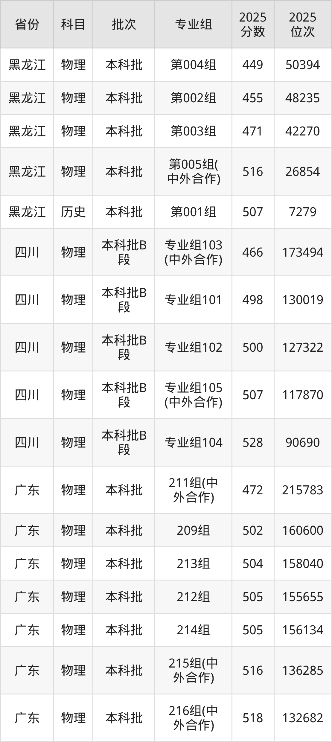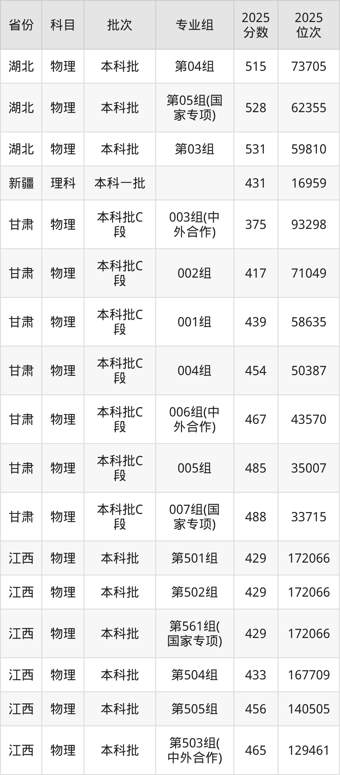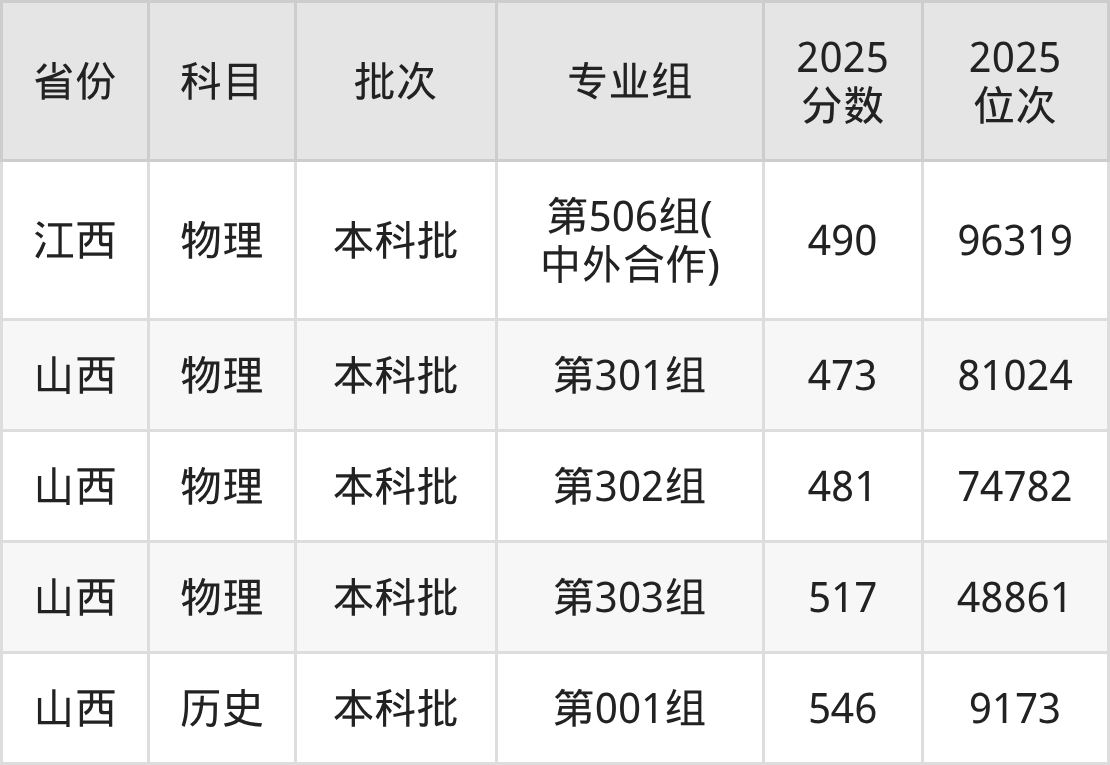 2025年在本科物理类进行招生,各专业组分数线详情如下: