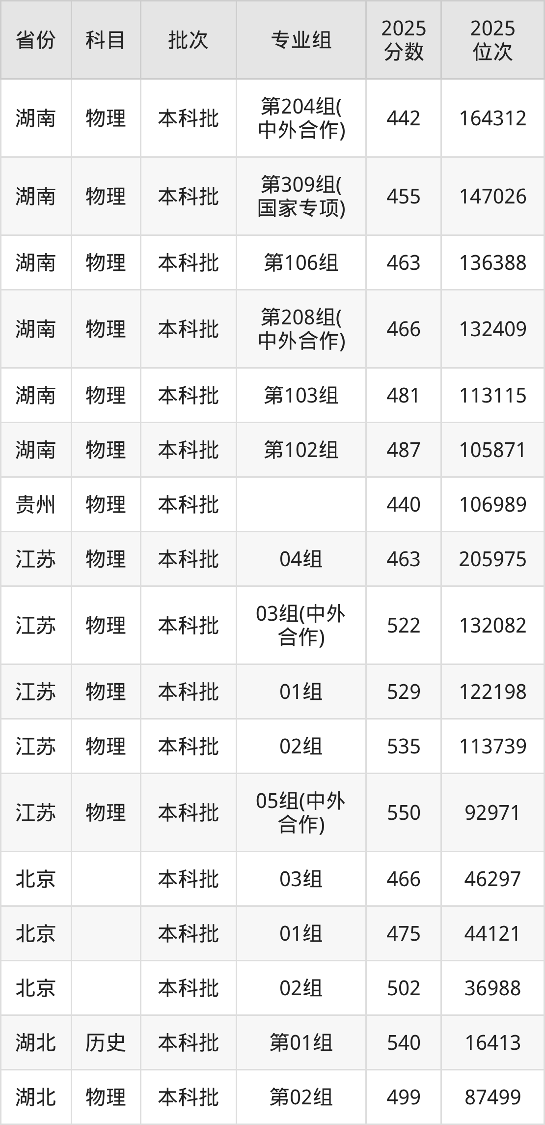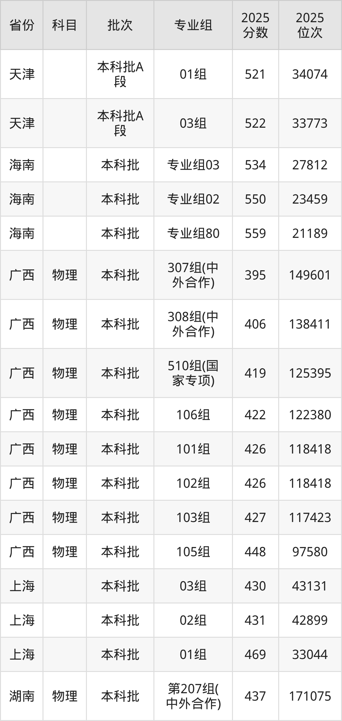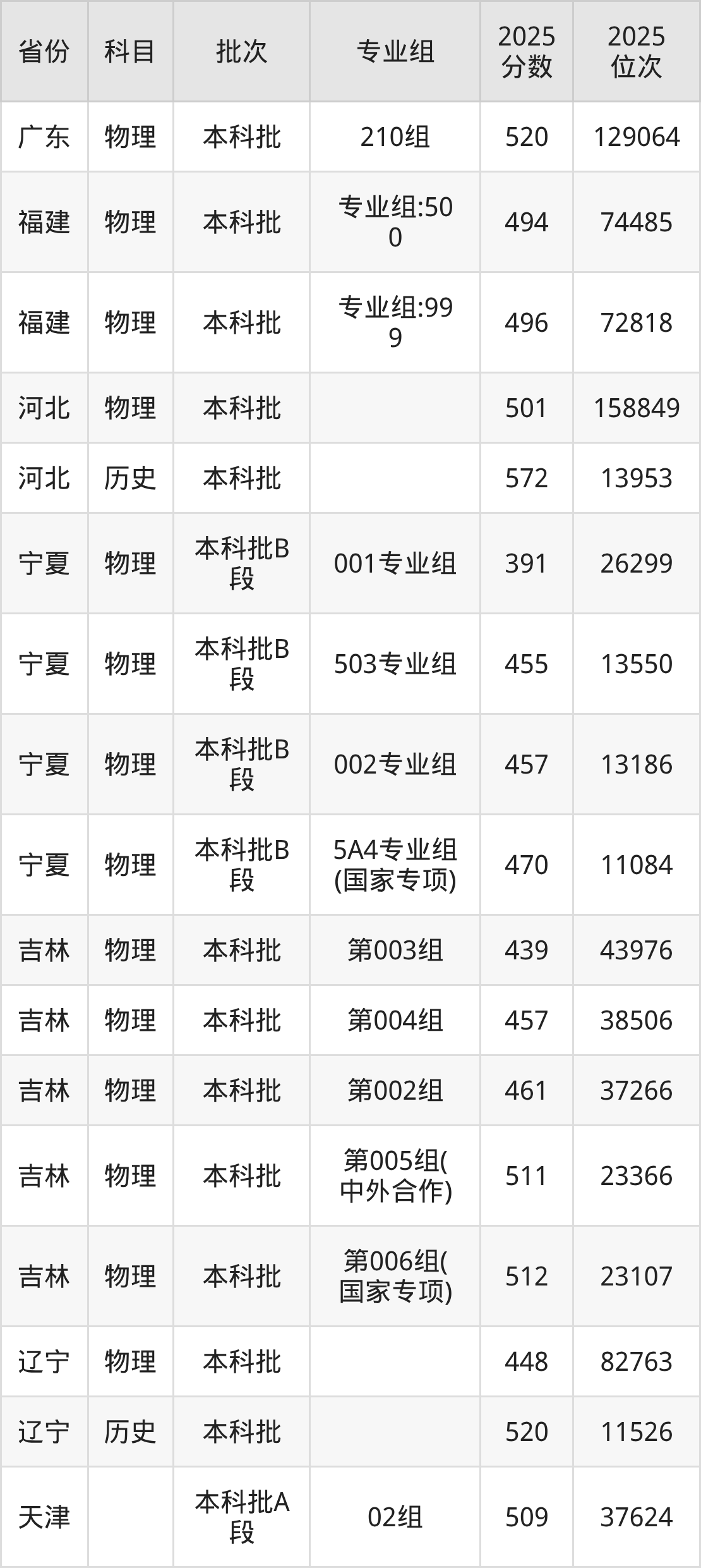 2025年在本科物理类进行招生,各专业组分数线详情如下: