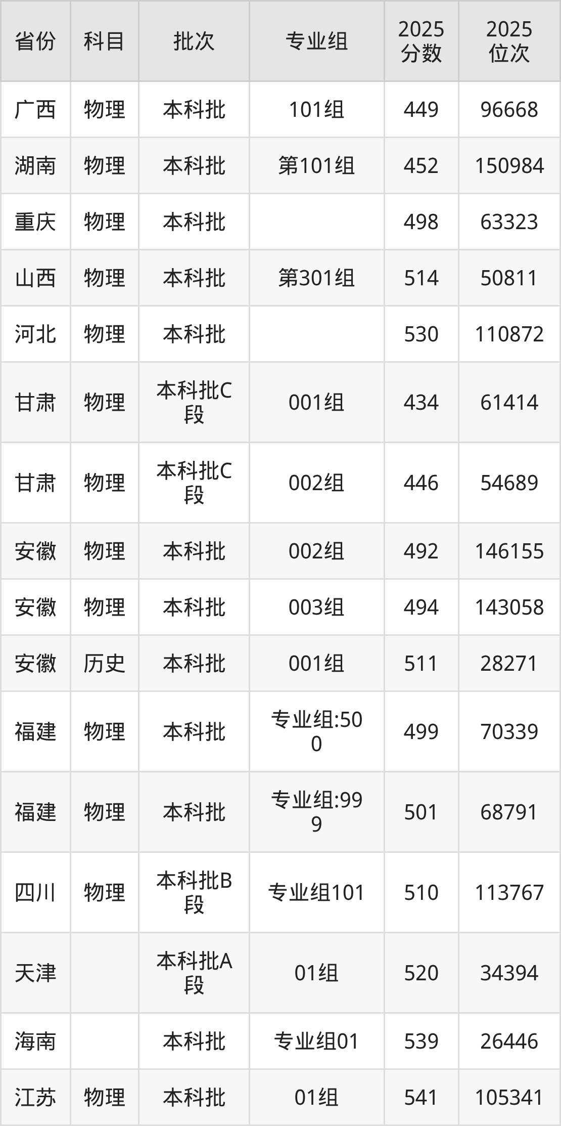 2025年在本科物理类进行招生,各专业组分数线详情如下:
