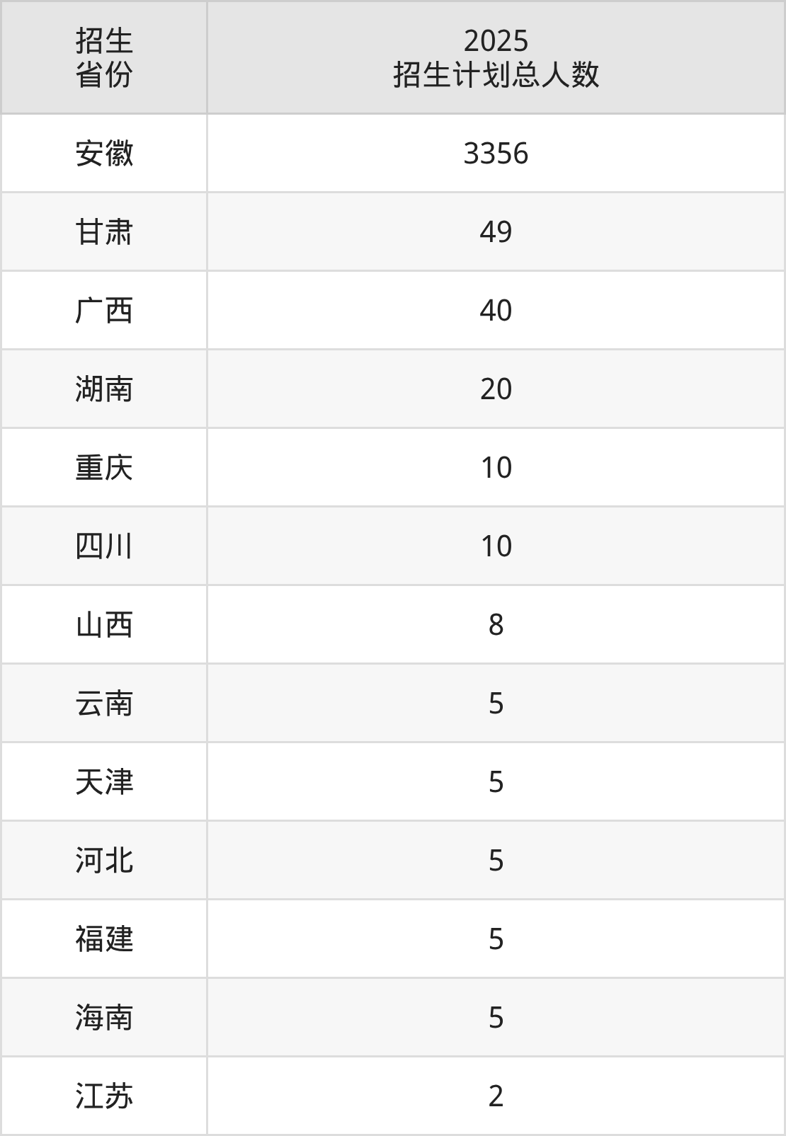 2025年蚌埠学院面向全国13个省市开展本科招生;招生专业共42个,招生人数共3520人。2025年在安徽省招生计划总人数是3356人,其中,蚌埠学院在安徽省招生人数最多的是水利水电工程。蚌埠学院在各省具体招生人数情况如下表。