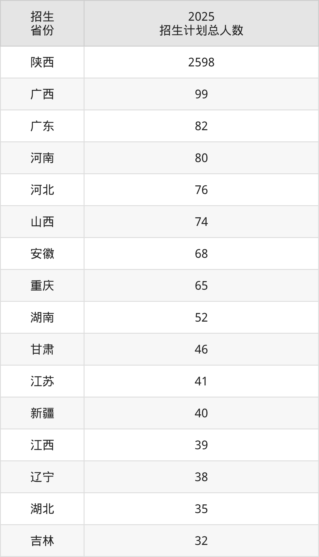 2025年西安邮电大学面向全国28个省市开展本科招生;招生专业共45个,招生人数共3693人。2025年在陕西省招生计划总人数是2598人,其中,西安邮电大学在陕西省招生人数最多的是通信工程。西安邮电大学在各省具体招生人数情况如下表。