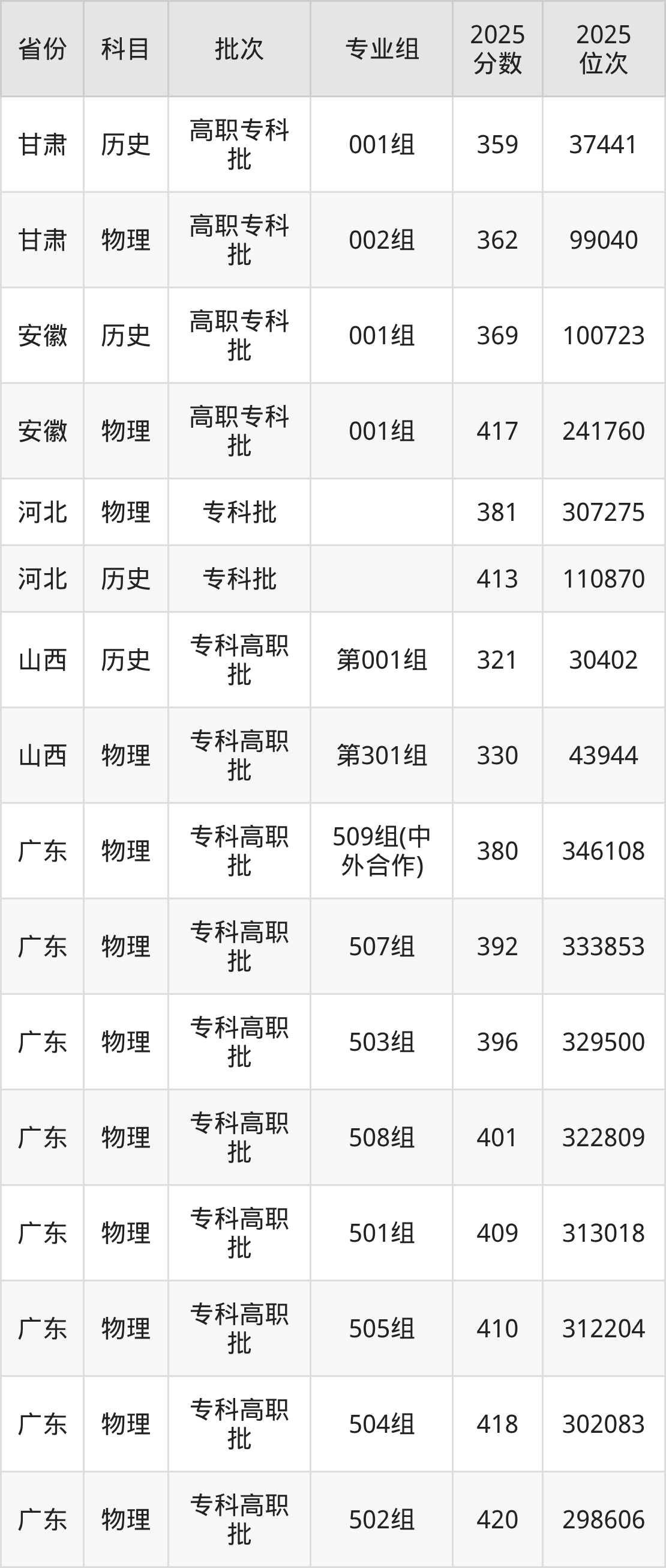 广东理工职业学院001组:2025年投档录取最低分为369分,录取最低位次为100723名。