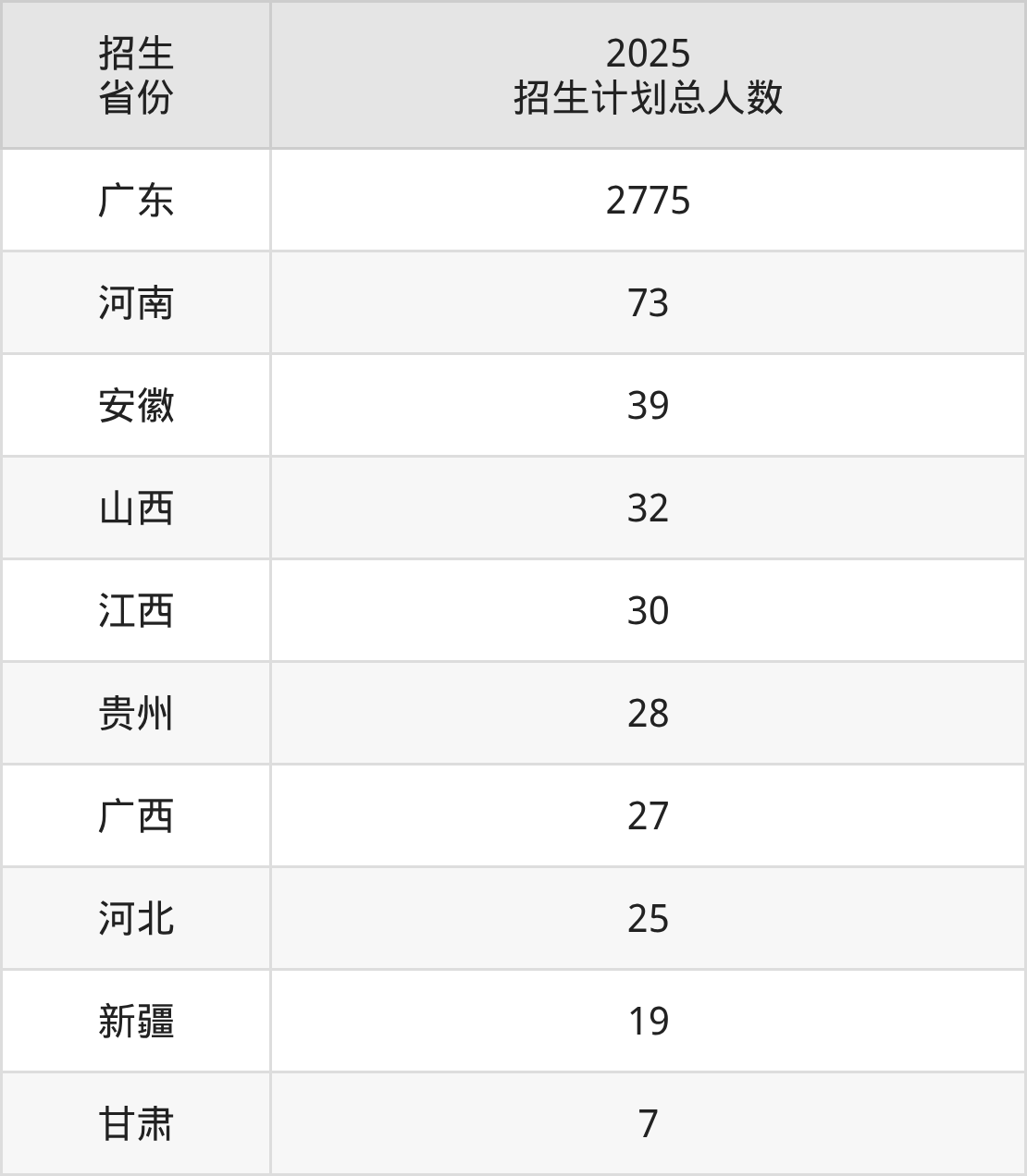 2025年广东理工职业学院面向全国10个省市开展专科招生;招生专业共46个,招生人数共3055人。2025年在广东省招生计划总人数是2775人,其中,广东理工职业学院在广东省招生人数最多的是工业机器人技术。广东理工职业学院在各省具体招生人数情况如下表。