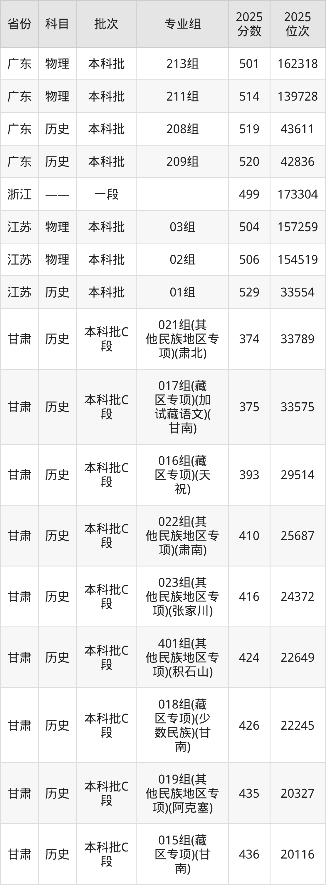 天水师范大学018专业组(藏区专项)(少数民族)(甘南):2025年投档录取最低分为426分,录取最低位次为22245名。